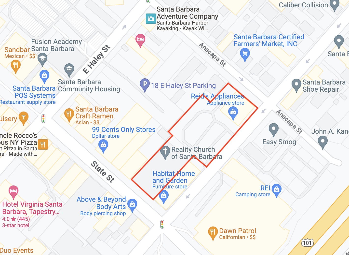 The only project on this list that’s actually under construction is the one at 410 State Street, which also fronts E. Gutierrez Street. In August 2020, the Santa Barbara News-Press described it thus: “This new development involves retaining and modifying the approximately 17,150-square-foot building at 410 State St. [Reality Church] and retaining the approximately 6,800 square-foot building at 409 Anacapa St. [Reid’s Appliances], a voluntary lot merger to combine the three parcels, and construction of a new 84-unit, four-story Priority Housing project over the east parking lot” on E. Gutierrez Street. The architect is Cearnal Collective.