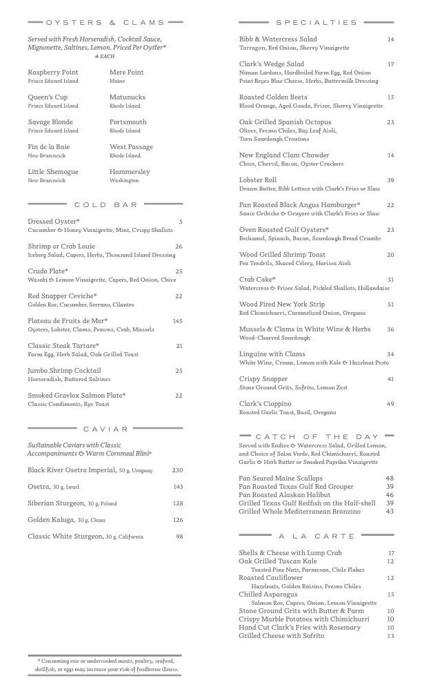••• After I posted the rumor that the Montesano Group (Lucky’s, Tre Lune, et al) will be leasing the former Cava space, someone else had it on good authority that the site will actually be an outpost of popular Aspen restaurant Clark’s (and not necessarily with the Montesano Group’s involvement). I tried reaching out to Clark’s PR rep, but I got no response. Know more? As always, tips are welcome and anonymity is guaranteed: text 917-209-6473 or email [email protected]. UPDATE: Apparently, Clark’s is more of an Austin restaurant (that subsequently opened an offshoot in Aspen). Since this is looking more likely, I thought you might want to see the menu….