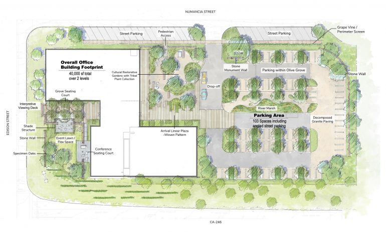 ••• Here’s a statement from John Elliott, CEO of the Santa Ynez Band of Chumash Indians, about the 31,250-square-foot building proposed for Santa Ynez: “We’re currently exploring ways to create more office space to support Chumash Enterprises. This proposed office building would help centralize our administrative services in Santa Ynez, which would serve as a convenient location in close proximity to the Chumash Reservation.” And the site plan and rendering below came in after I ran the initial mention.