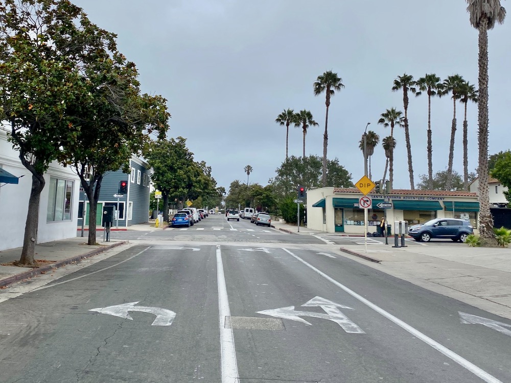 ••• The city’s Streets Operation and Infrastructure Management division weighed in about Elle’s question regarding the intersection at Anacapa and Haley. (After the city changes the block of Anacapa between Haley and Gutierrez from one-way to two-way, will drivers heading south on Anacapa still be able to turn left on red from the far left lane?) The traffic engineer I spoke with said it’s his understanding that drivers in the far left lane will, in fact, be able to lawfully turn left on red, because they’re still turning from a one-way street onto a one-way street. And the middle lane in the photo below will be converted to a left-turn-only lane, which makes me wonder about possible conflicts between drivers in that lane and ones across the intersection turning right onto Haley…. I guess we’ll all learn to cope.
