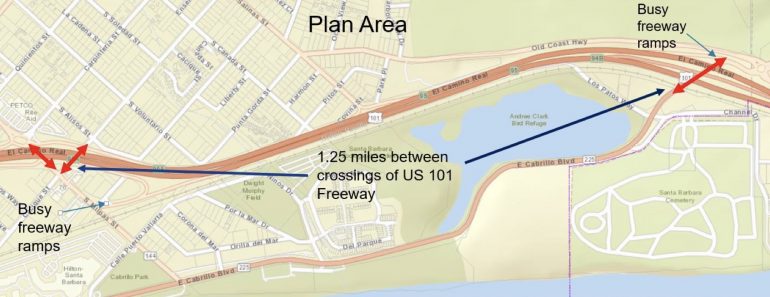 ••• The city is considering “a possible new bicycle and pedestrian freeway overcrossing between the Eastside and the vicinity of Dwight Murphy Field.” There’s a Zoom meeting on October 25. As the graphic below, shows, the Eastside could use a way to get south of the freeway including to the beach.