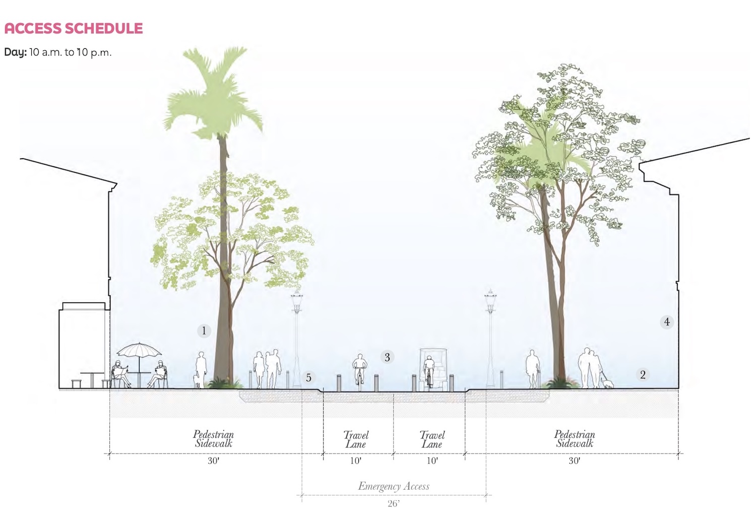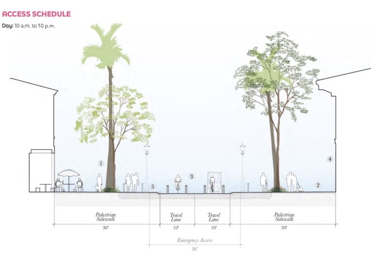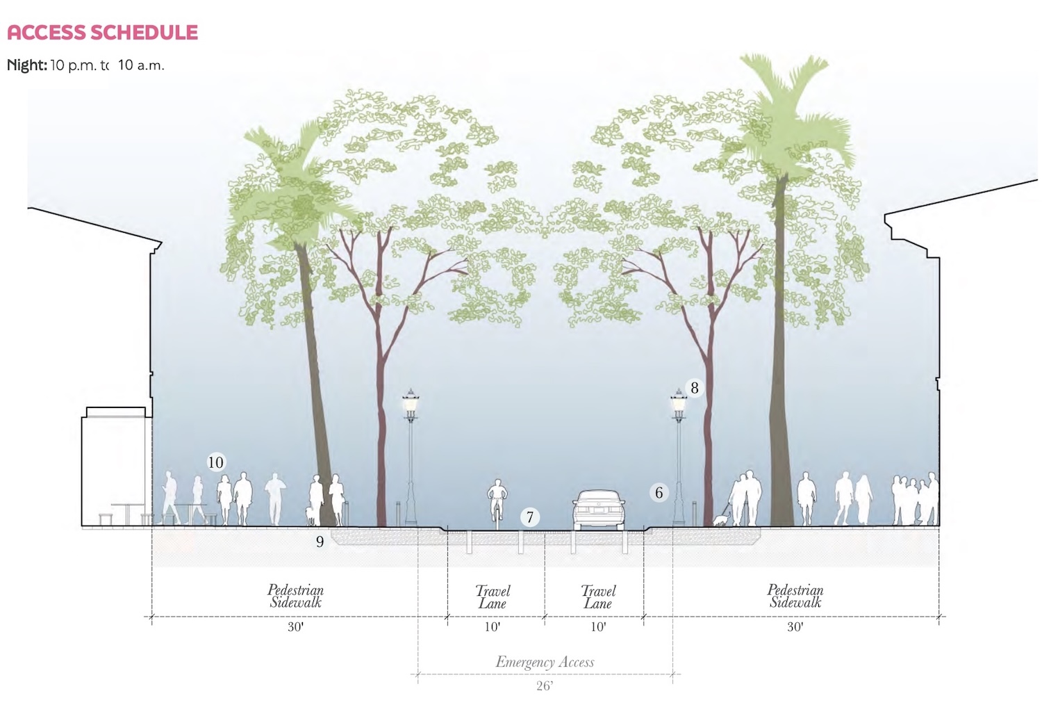 From 10 p.m. to 10 a.m., the bollards get lowered. “Vehicles allowed for deliveries, refuse collection, maintenance, and private access. A City appointment system will accommodate special construction and delivery needs outside normal windows.”