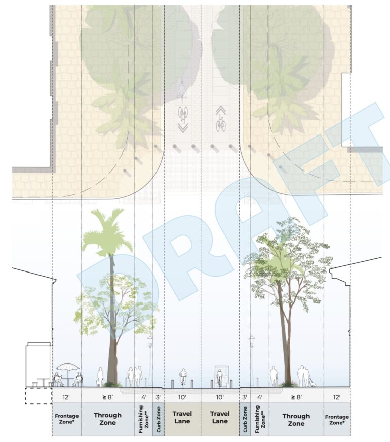 • Two 30-foot pedestrian sidewalks (~60 feet total) on either side, organized into a Frontage Zone (outdoor dining up to 12 feet), a Through Zone (minimum eight feet, clear of obstructions), and a Furnishings Zone (trees, lighting, seating, bicycle parking).