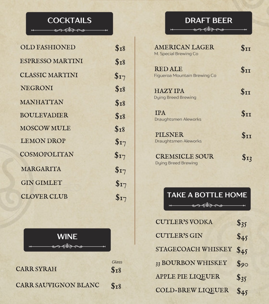 ••• Cutler’s Distillery & Public House (418 N. Salsipuedes Street) is now open daily from 5 p.m. to 10 p.m. The dinner menu is below, with more items to be added soon, and lunch should start up in the next week or two.