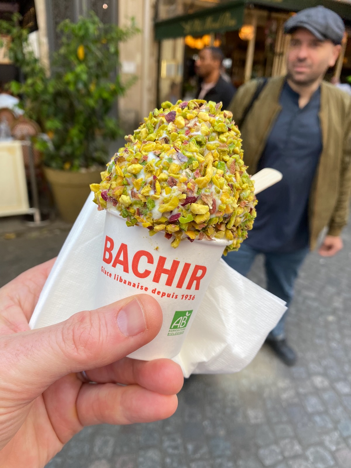 There was more: orange blossom lemonade at Liza, Lebanese ice cream at Bachir, marinated sardines at Clamato, a softball-size scoop of chocolate mousse at Tekès, beautiful sorbets (served inside the hollowed-out fruit) at Fruttini, and so on.