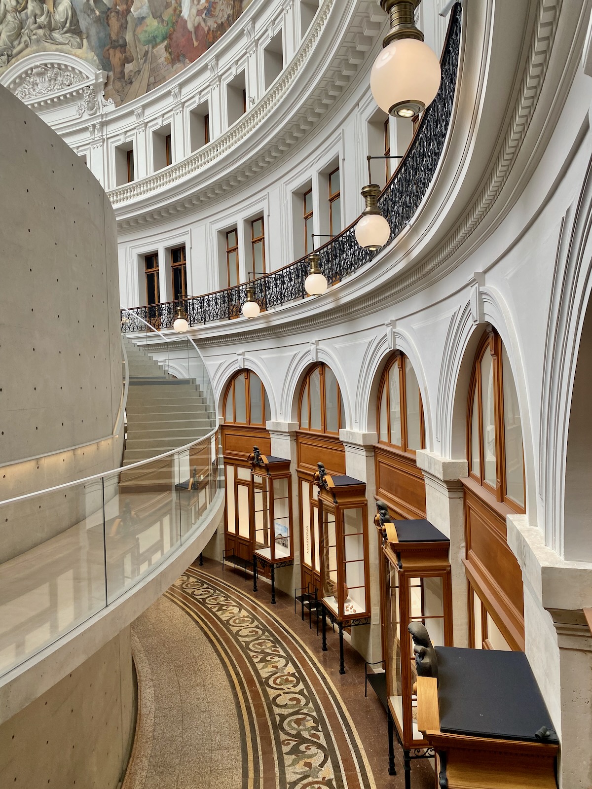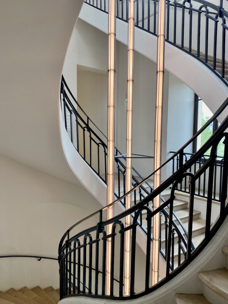 The most striking thing in the museum is the old double-helix staircase. At one point in its history, the building was a corn exchange, and “the two ramps, which intertwine in two distinct helixes […] allowed the porters who went up and down [with] the voluminous sacks of corn to avoid crossing each other.”
