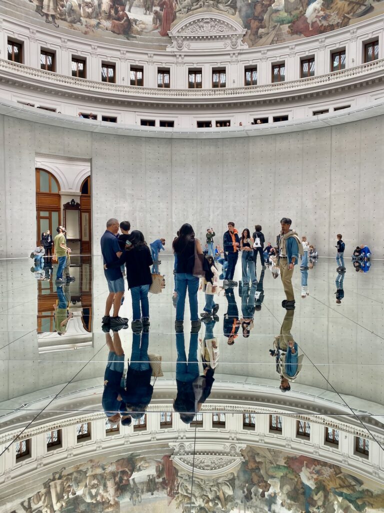 I went to more museums than I had planned on, including the Orangerie, the Musée Bourdelle, the Maison Latin America, and the Centre Pompidou. (I was lured to the latter by a big Brâncuși show. I always hope a gift shop will sell miniatures of his sculptures as paperweights.) Adam also visited the Musée d’Orsay, only to find it overwhelmed with people. My favorite museum was the Bourse de Commerce, François Pinault’s temple to his art collection and his ego, perhaps not in that order. Architect Tadao Ando inserted a concrete cylinder in the old round building, to supremely cool effect; as a temporary installation, South Korean artist Kimsooja put mirrors on the floor—a selfie trap to which we happily succumbed.