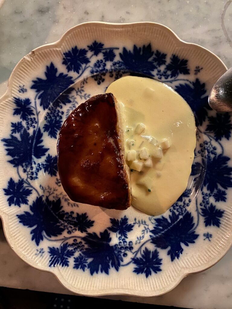 For many years now, the big trend in Paris dining has been the neo bistro, a cooler, more creative take on the classic bistro. We went to a few, but the only one we loved was Vivant 2. It’s loud and cramped, and we felt old, but we got over it. The food was excellent, particularly the decadent celery root with sabayon (below). Our seats were right by the chefs, so we asked whether there really wasn’t any pork fat in the dish. “I wish I could use pork fat,” he said, then added sadly, “but it’s the only vegetarian option.” And the music—a little disco, a little Euro, a little New Wave, a little camp, a little rock and roll—hit my sweet spot with a wallop. (I’ve listened to nothing else ever since.) Perhaps I earned extra points by identifying “One Night in Bangkok” from its instrumental intro, because the chef gifted us a plate of lamb kidneys.