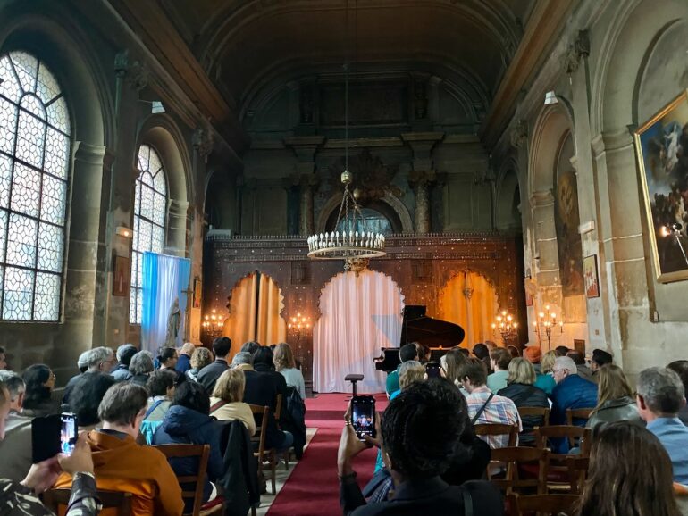 Regrettably, we didn’t do much advance planning in regard to other cultural activities. But Adam did find a piano recital at the small church, Église Saint-Éphrem-le-Syriaque, near the Sorbonne. The pianist played movements from various works by Chopin, Debussy, and Satie in candlelight, which set a marvelous mood, aided by a percussive burst of rain.