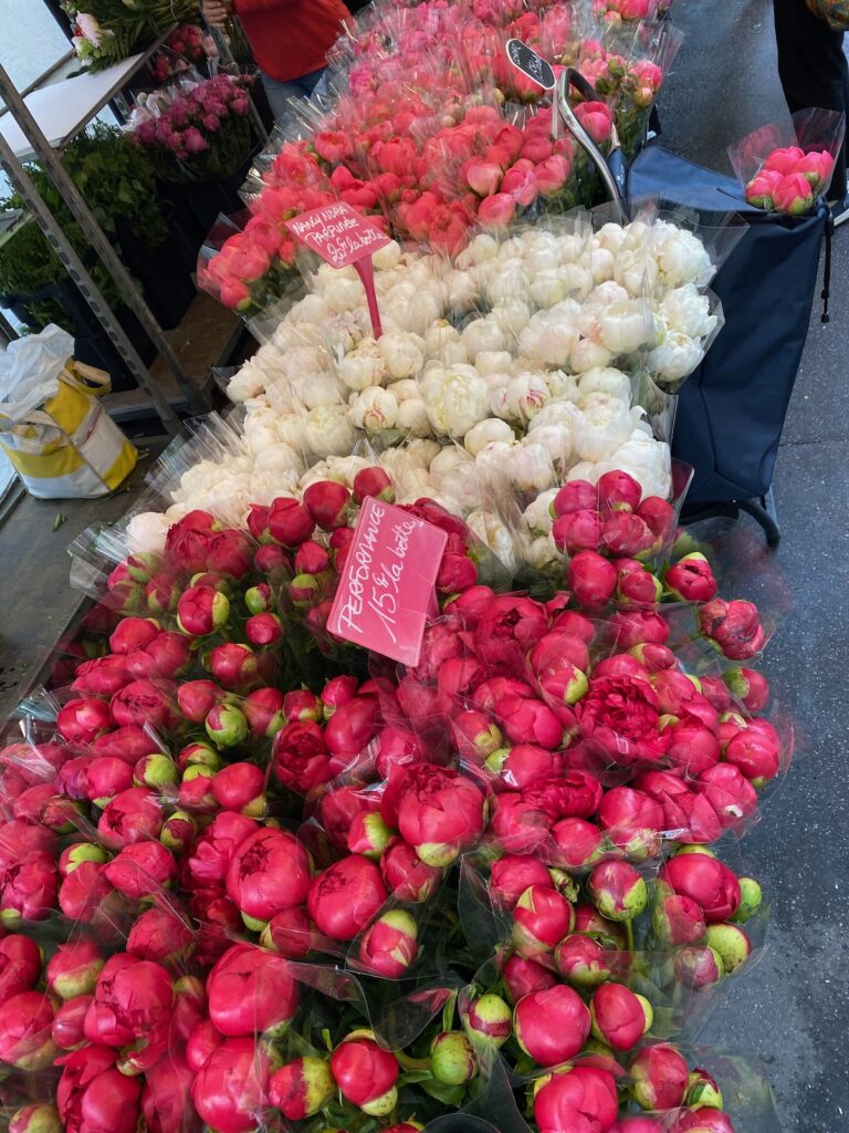 We thought we would cook now and then, what with the apartment and all, but it seemed like too much of a hassle. We did buy flowers, though, at the Sunday farmers’ market on Boulevard Raspail. Strolling through Paris while carrying a bouquet of peonies was like something out of a movie or a dream.