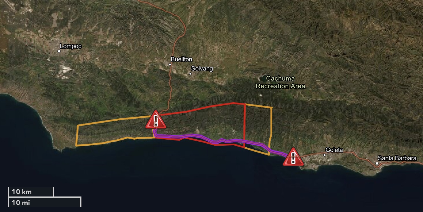 ••• Here’s the county’s map of the latest evacuation order and warnings, including one for Hollister Ranch (screenshot at right).
