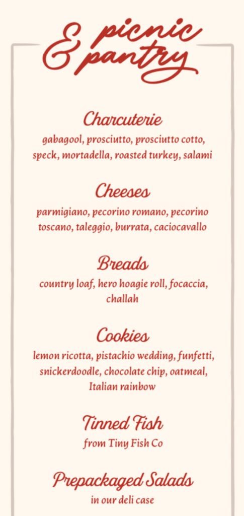 The space, which faces Cabrillo Boulevard, will be 2,761 square feet inside and 1,276 square feet outside. Promotional materials describe the atmosphere as “coastal Italy meets coastal California.” The restaurant plans to be open for breakfast, lunch, and dinner, and also offer “picnic and pantry” items. As you can see from the sample menu below—sorry it’s blurry, but that’s how it came to me—the food leans heavily toward classic Italian-American, with menu items such as garlic bread, chicken parm, clams oreganata, and shrimp scampi.