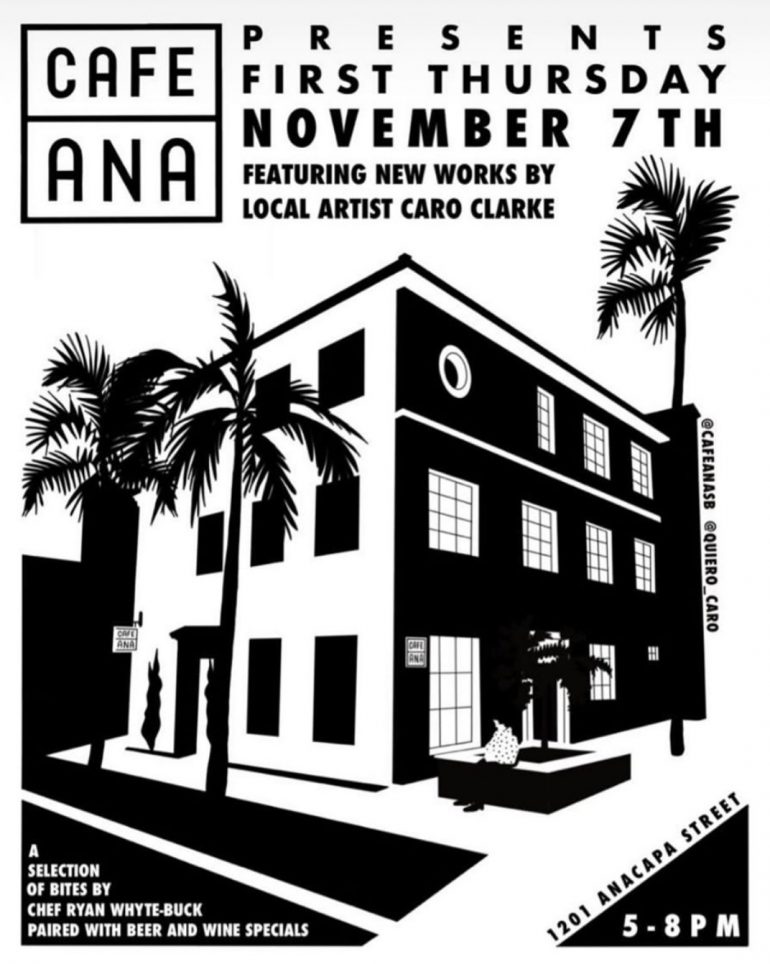 ••• Work by Caro Clarke will be featured at Café Ana on (or maybe starting?) the First Thursdays event on November 7. The print she did of the café is wonderful. (And check out this beautiful piece.)
