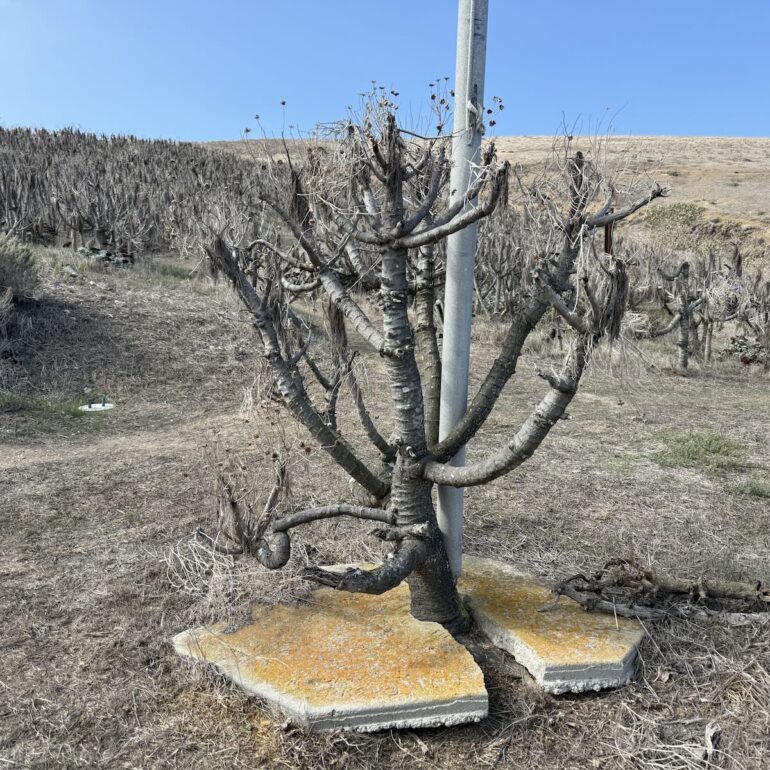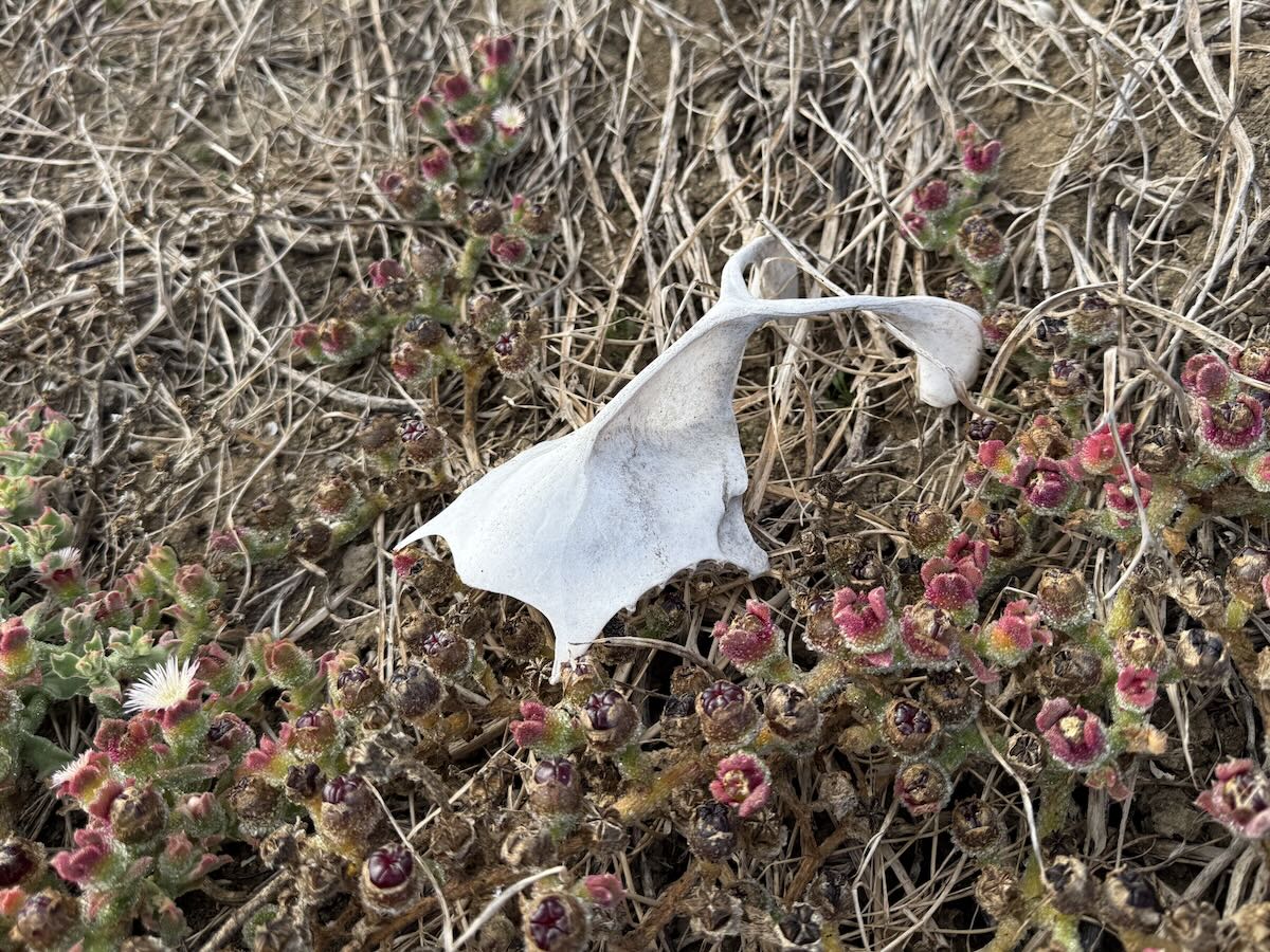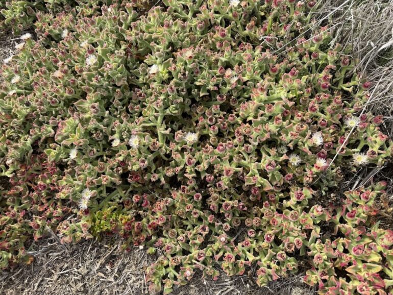 The plant pictured below was everywhere, including in the middle of the trails, where I made efforts to avoid stepping on it—only to learn later that it’s a “noxious invasive species” (in a friend’s words) called crystalline ice plant.