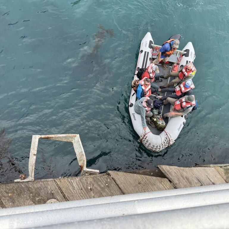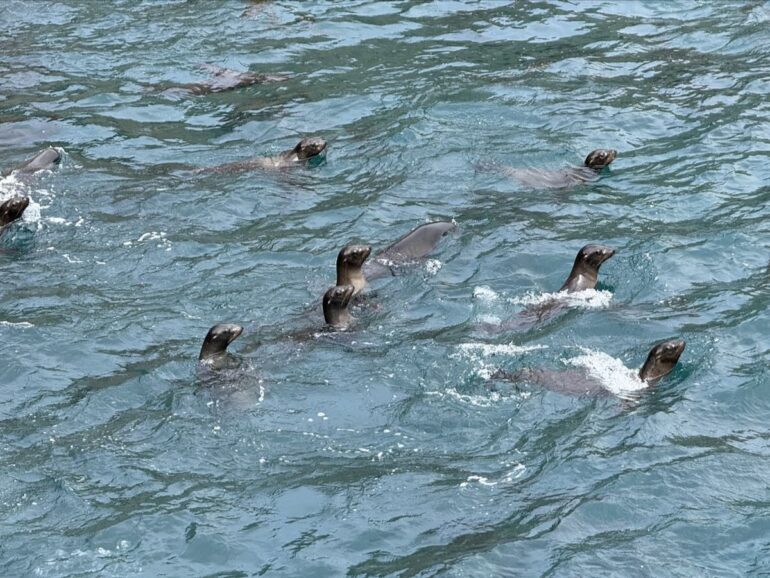 We were transferred by skiff to the island in groups of six, and while disembarking was a little dicey because of the swells, the slippery rock, and the pier remnants that you have to duck under, we all managed with aplomb. Our reward was the group of young sea lions frolicking in the surf and poking their heads up, like meerkats or synchronized swimmers, to observe our arrival.
