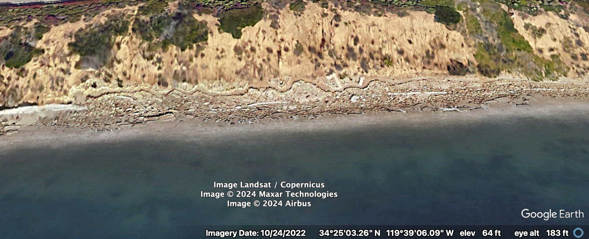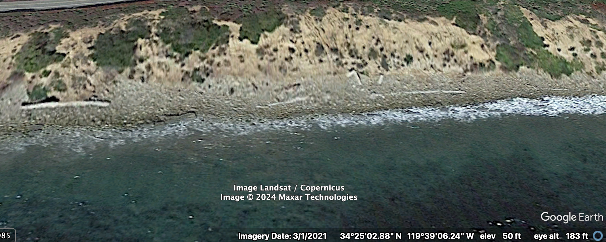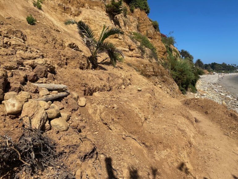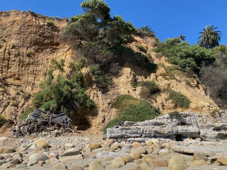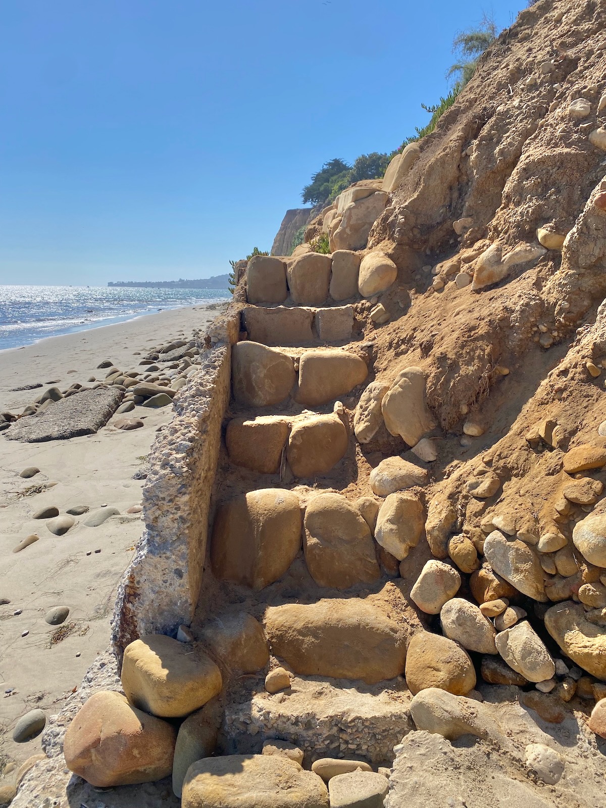 ••• “Do you know the story behind the trail between Butterfly Beach and East Beach?” asked D. “It’s well-developed and a convenient way to avoid some of the rocks, although it stops short of going all the way to East Beach. I looked at at Google Earth historical satellite footage and it appears to have been created somewhere between March 2021 and October 2022.” This was the first I’ve heard of it, so I went to take a look. I’m not sure how I could’ve missed the path, which someone has spent a lot of time and effort on; it includes serious stone steps, and there appears to be terracing in progress above one stretch. Getting permission for this kind of thing—from the property owners, the county, and the Coastal Commission—would be virtually impossible, so I imagine it’s more of a personal undertaking. And I wouldn’t be surprised if whoever lives (or hangs out) in the driftwood shelter is responsible, seeing as how the path ends there. P.S. Explore it at your own risk. The bluffs have been known to fall. UPDATE 9/10: The person responsible doesn’t live in the hut.