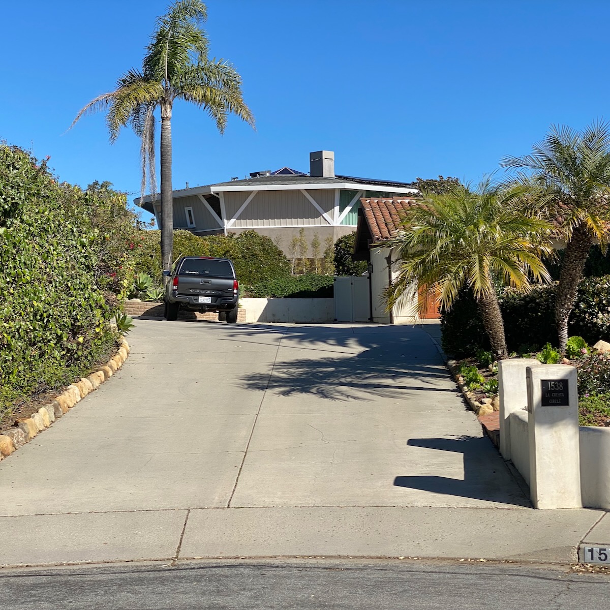 And at the end of the La Cresta cul-de-sac, you get a good look at the 1973 octagonal house at 1547 La Coronilla. Photos and a floor plan are still online from when it sold in 2019. On top is a roof deck.