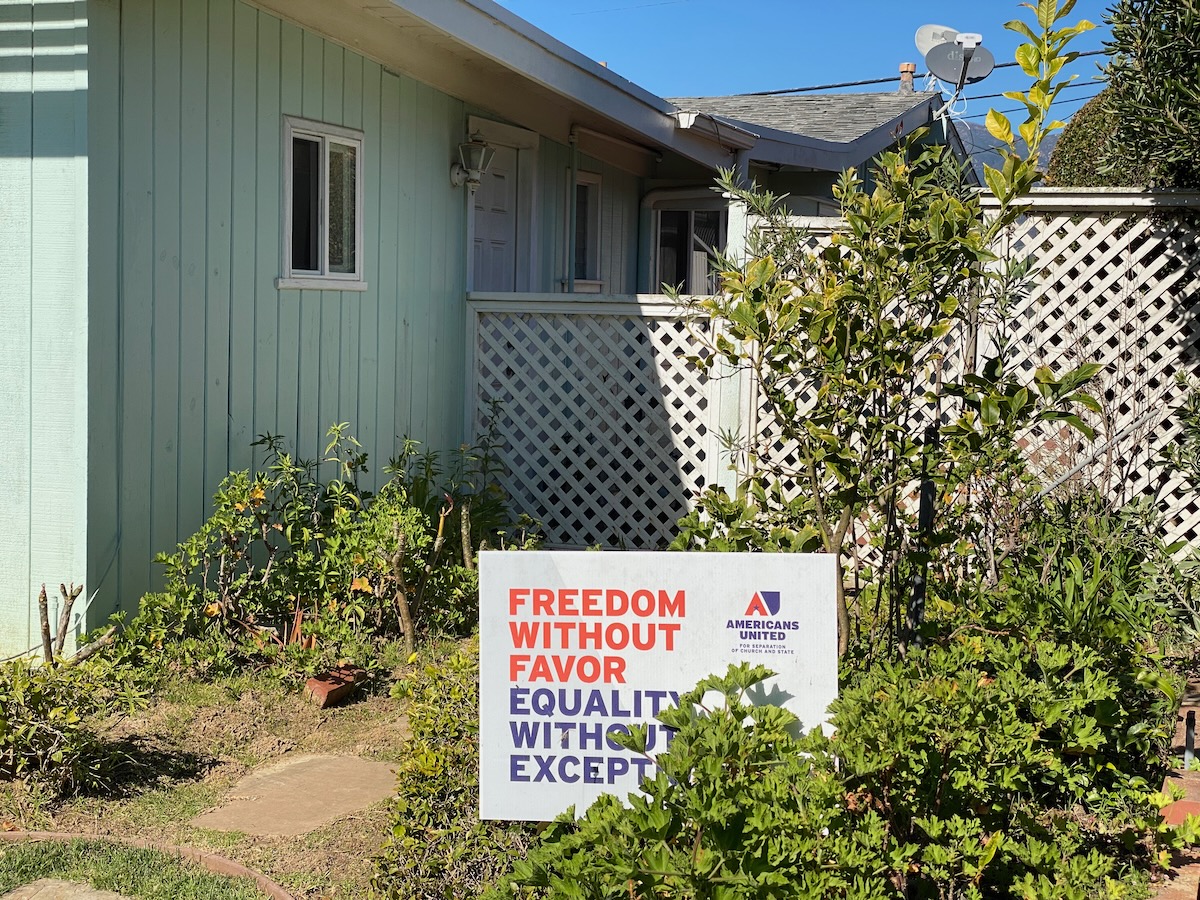 Much more pleasant: a sign for Americans United for Separation of Church and State—a fundamental principle on which our great country was founded, which too many people forget.