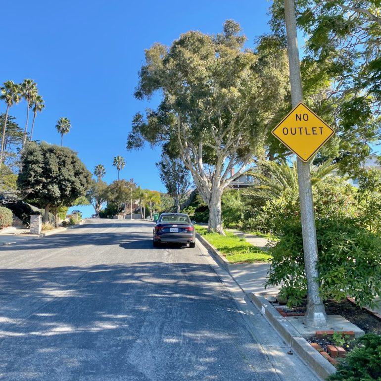 Naturally, I went back to check out the street. And I noticed that there’s a “no outlet” sign on Ricardo Avenue, just past Dolores Drive—which is strange, because you can walk, bike, drive, or even skateboard all the way to Cliff Drive. [UPDATE: “I live on Ricardo—that’s our kid painted little free library!—and when I first moved to the street (2009) there truly was no outlet,” commented Sarah. “I can’t remember exactly when they opened it up but the city never bothered to remove the sign at Dolores/Ricardo.”]