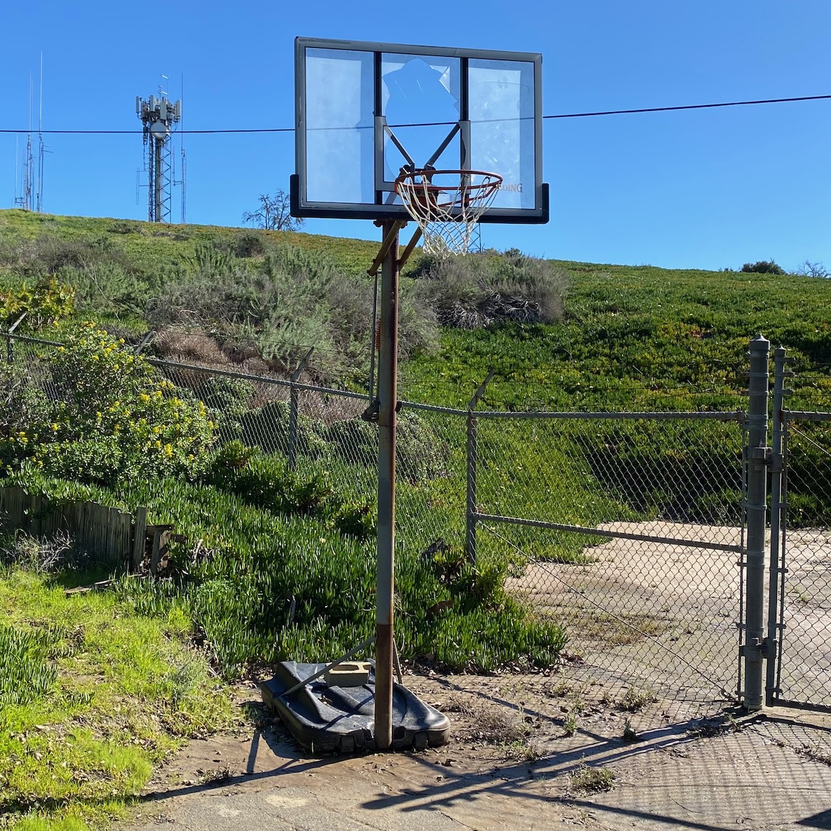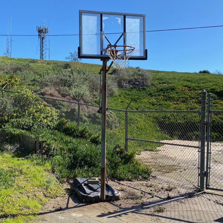 A driveway to the Vic Trace Reservoir has been turned into a makeshift basketball court, where someone dunked too hard. By the way, was Vic Trace a person? The name Vic has such a midcentury to ring to it, probably because of Vic Damone and Trader Vic’s.