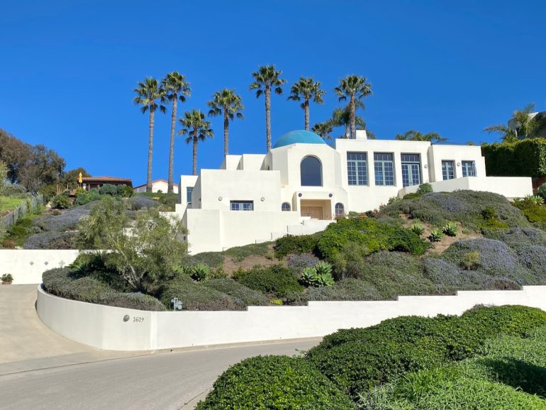The western end of Harbor Hills Drive is a cul-de-sac with a Neoclassical villa (here are some photos from when it was listed in 2020—I’d love to see how it turned out), and a super-contemporary one (the gray box to the right of the second photo). Bookmark that one in your mind, because we’ll get a much more satisfying look at it later. As you continue down the street, the architectural styles keep coming and the view really opens up. This is a stretch that’s sure to dazzle your out-of-town guests.