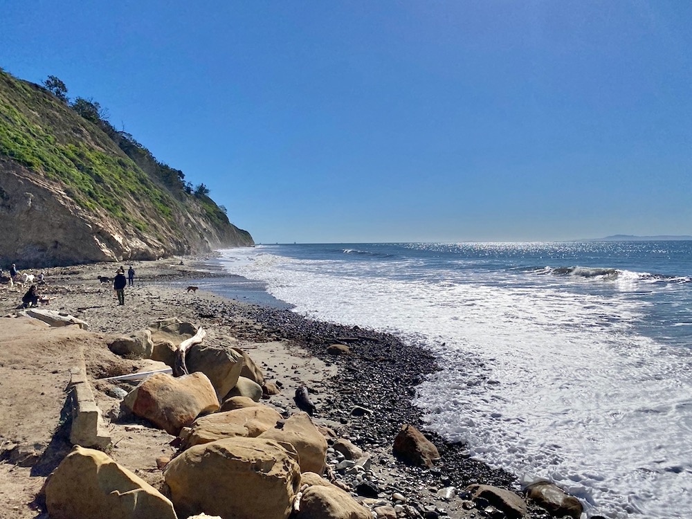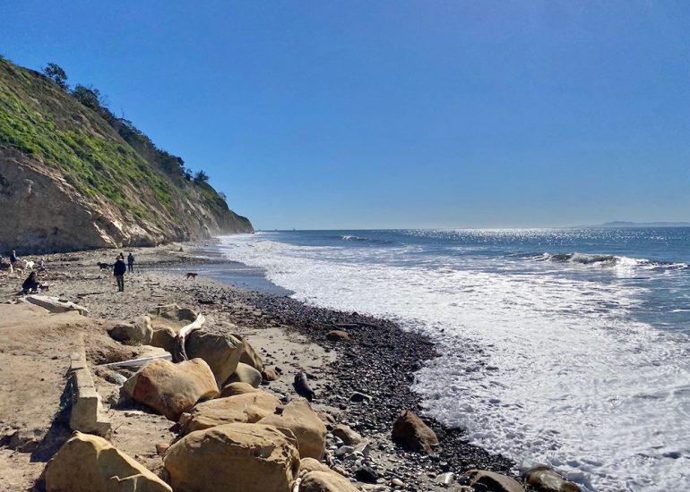 ••• KEYT on the dearth of sand at local beaches (including Hendry’s Beach, above), due to “a storm surge at the same time of an astronomical high tide [….] Long timers say, be patient, the beaches will come back, in part because of the normal cycle, and also because debris basin sediment is getting trucked to Goleta Beach. Richard Payne was on a dog walk and said, ‘the stuff that they are putting up in Goleta is going to come south this way and refill all this stuff.’ The rest will be left up the currents.”