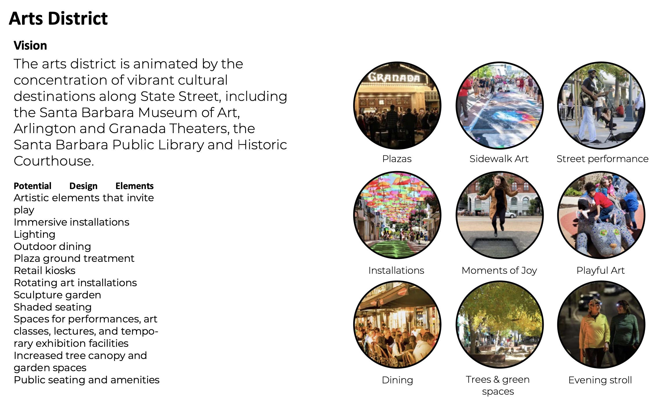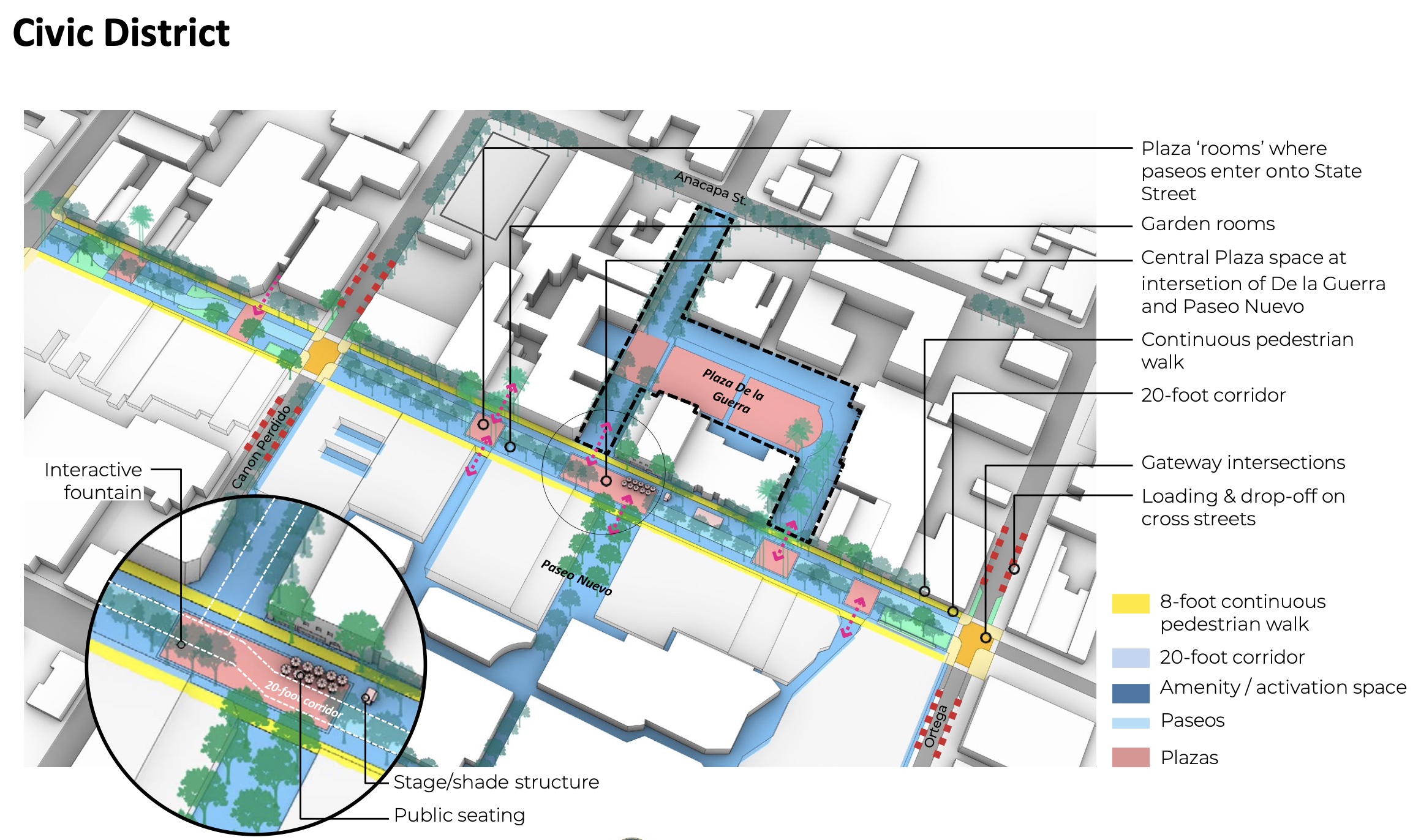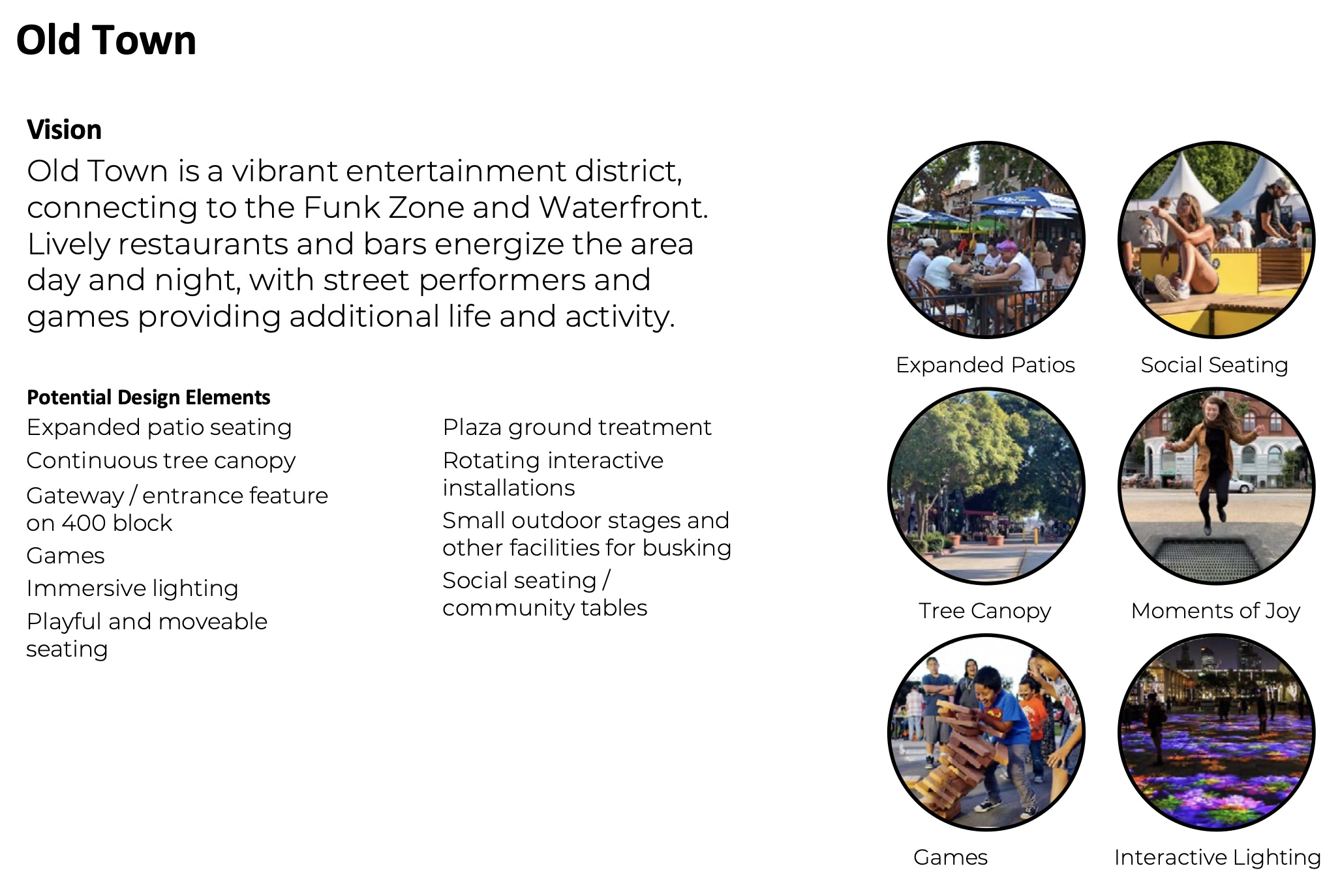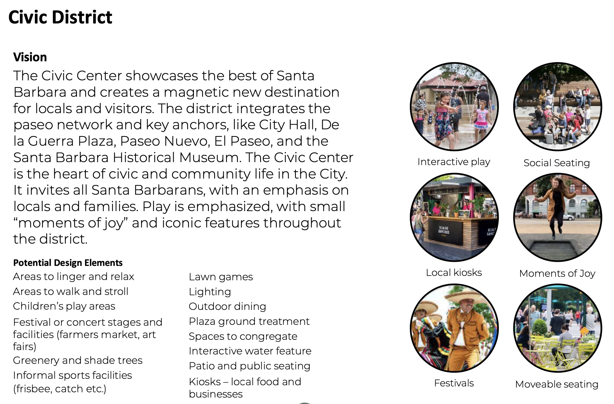 District #2, referred to as The Core on the map, is called the Civic District elsewhere in the presentation. It’s the three blocks from Ortega to Carrillo. I’ll leave it to you to figure out how the proposed design elements create “a magnetic new destination for locals and visitors”—or even how it substantively differs from Old Town.