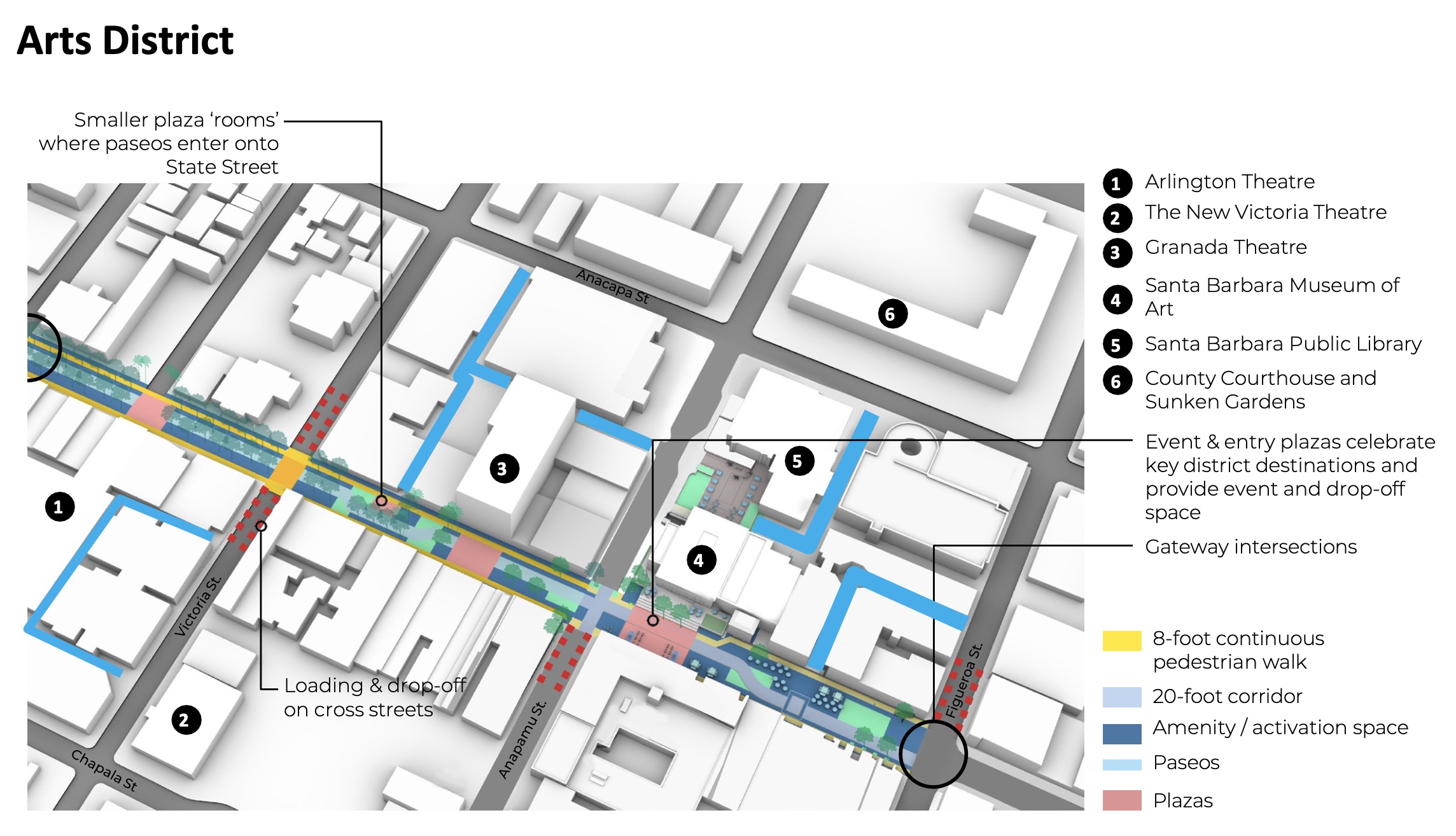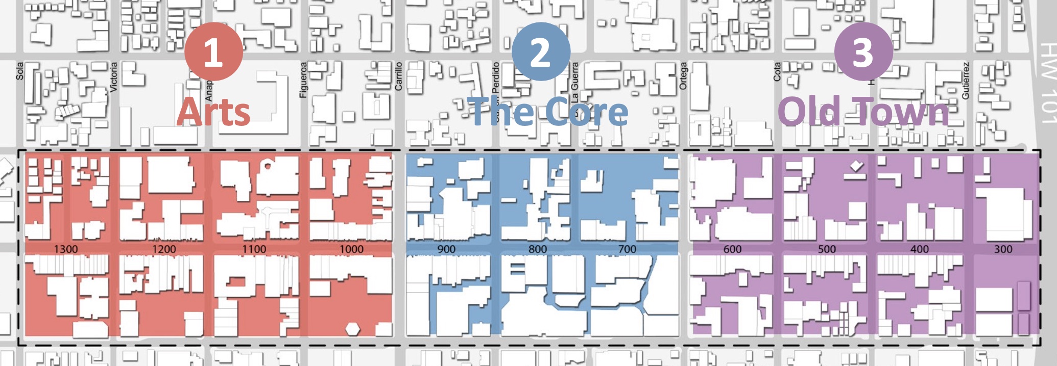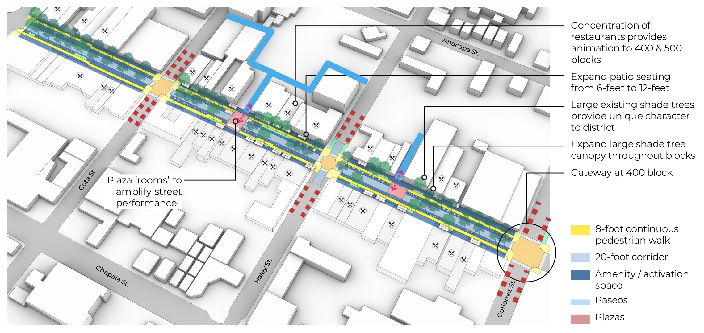 District #2, referred to as The Core on the map, is called the Civic District elsewhere in the presentation. It’s the three blocks from Ortega to Carrillo. I’ll leave it to you to figure out how the proposed design elements create “a magnetic new destination for locals and visitors”—or even how it substantively differs from Old Town.