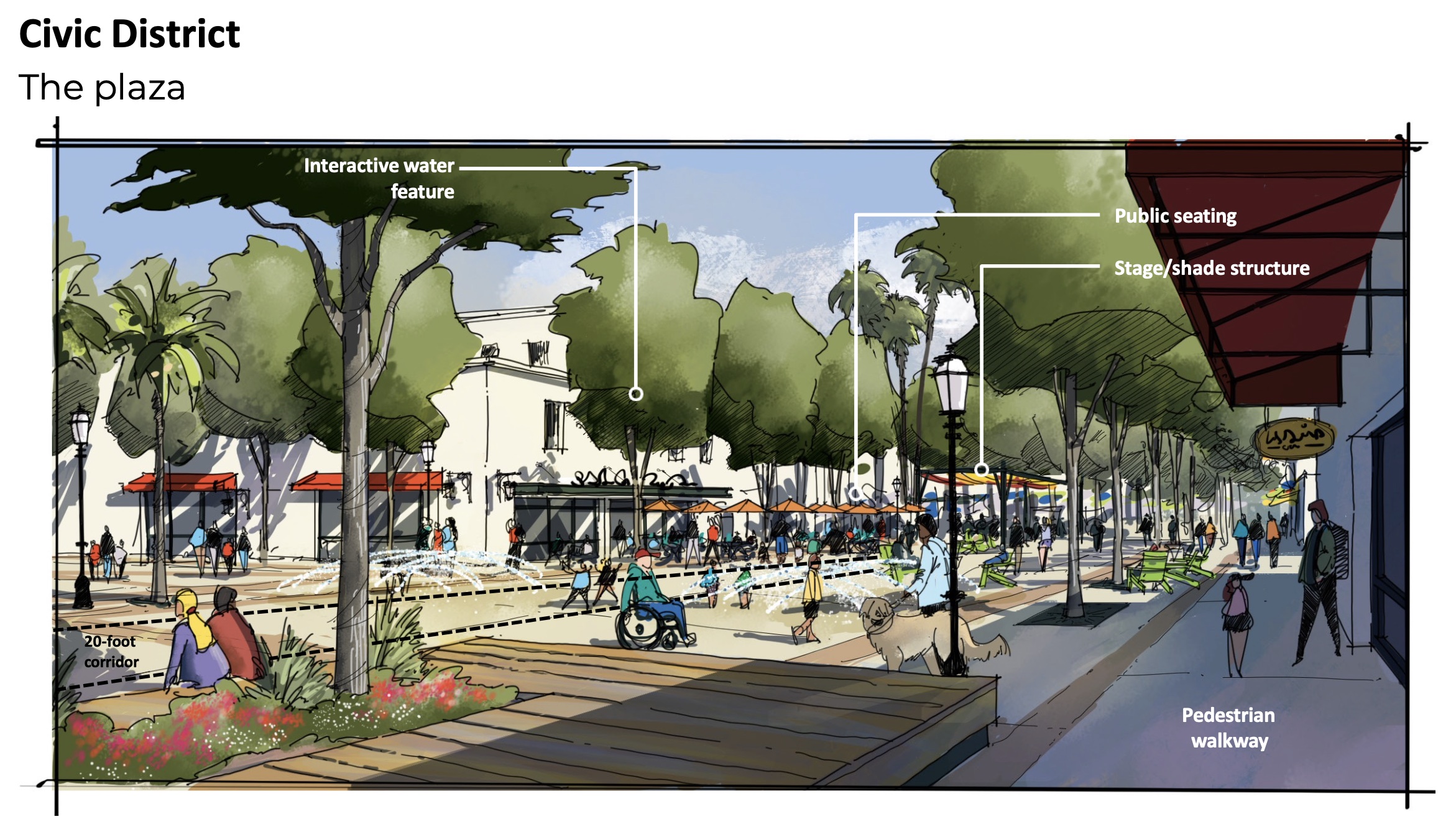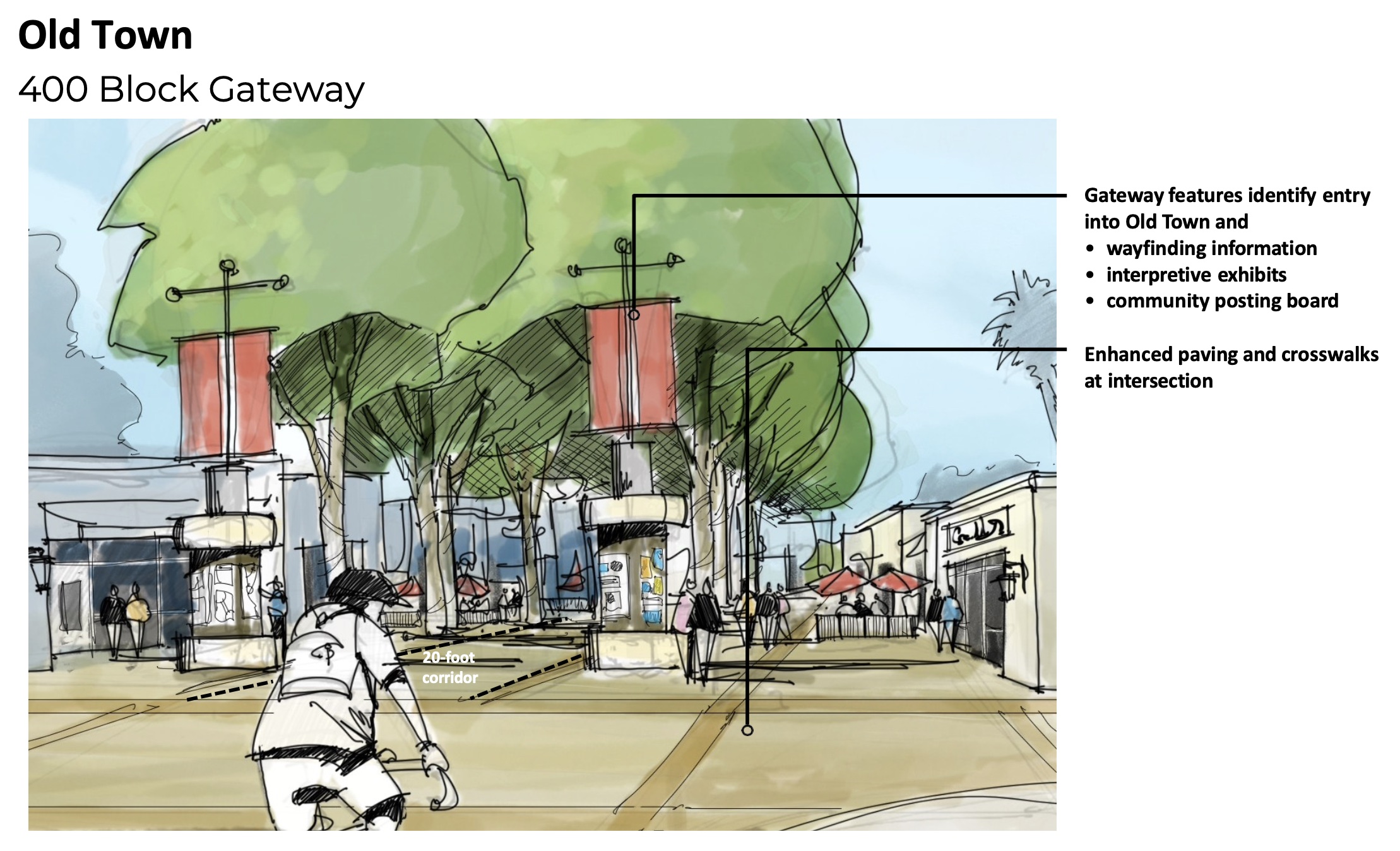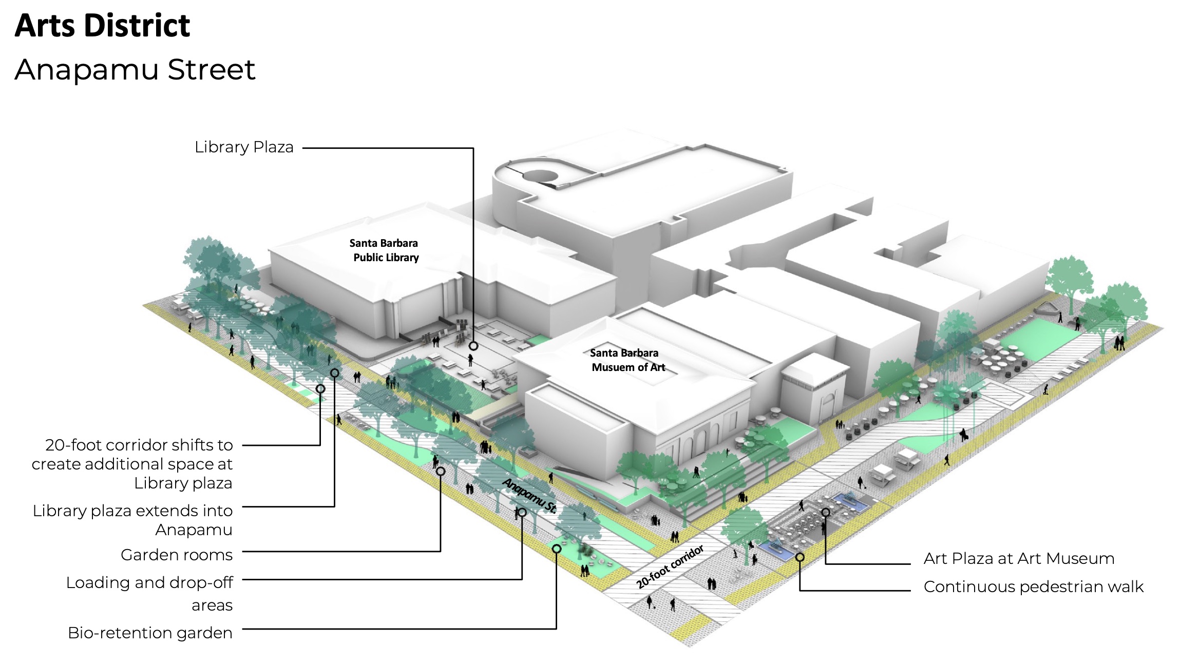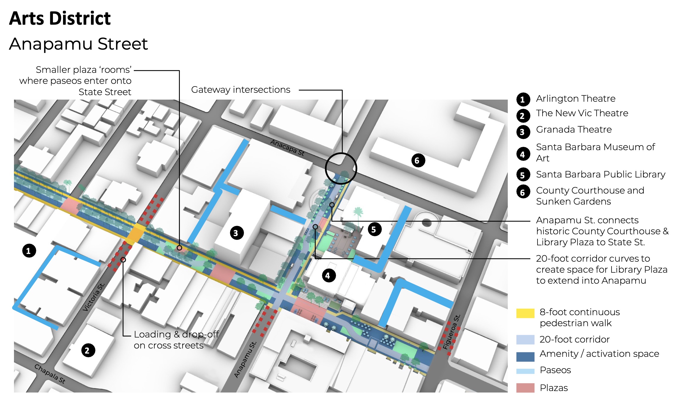 District #2, referred to as The Core on the map, is called the Civic District elsewhere in the presentation. It’s the three blocks from Ortega to Carrillo. I’ll leave it to you to figure out how the proposed design elements create “a magnetic new destination for locals and visitors”—or even how it substantively differs from Old Town.