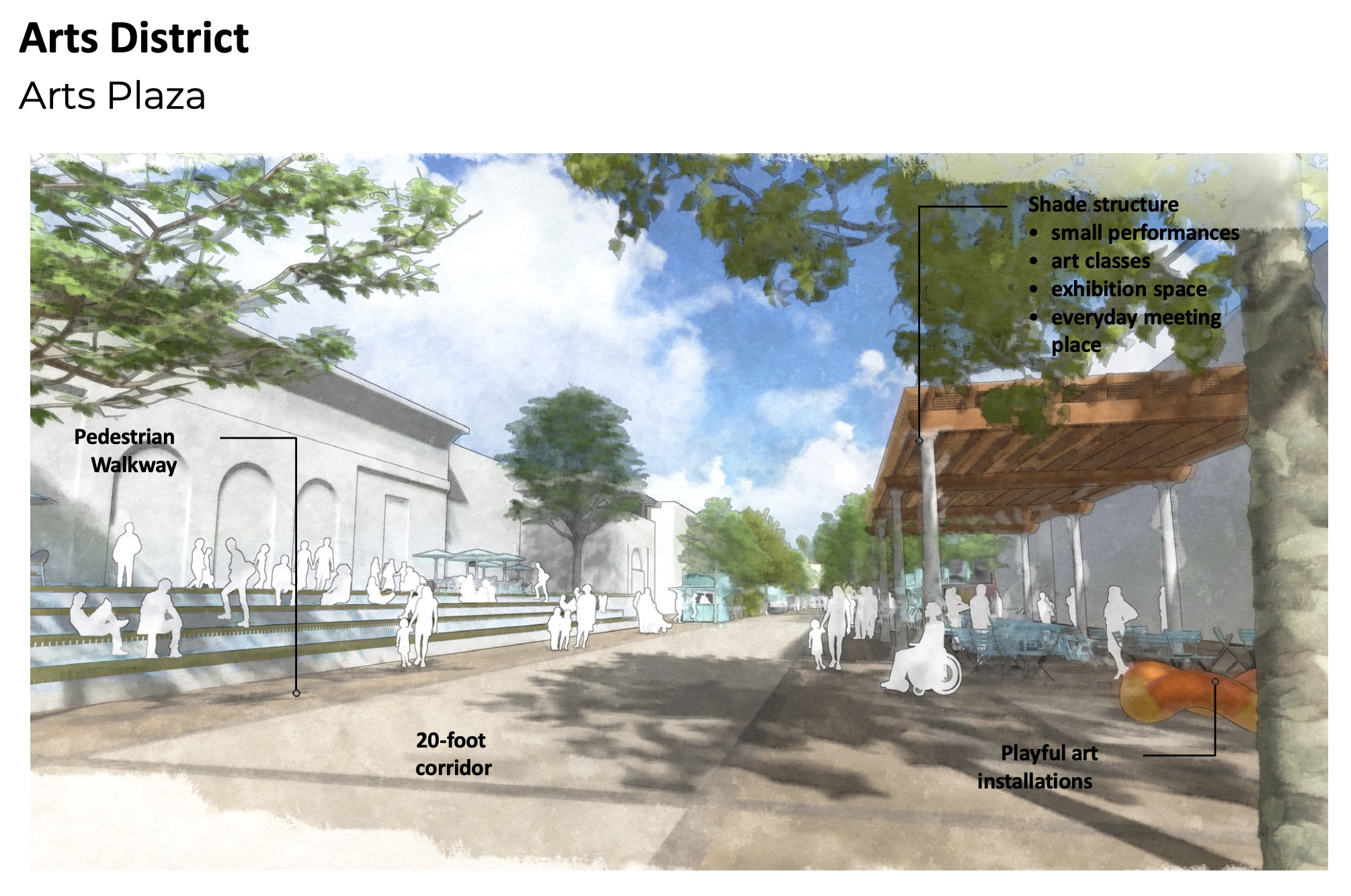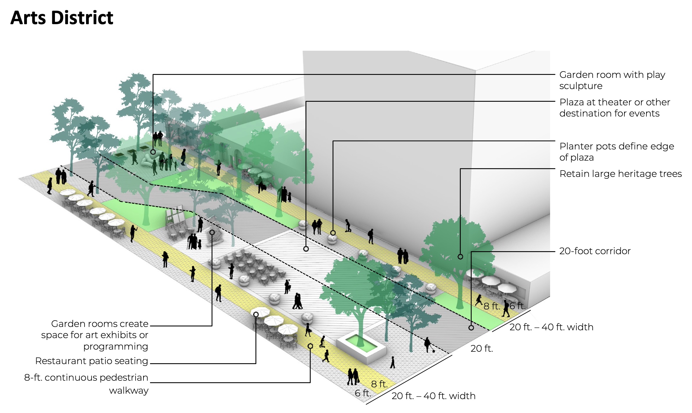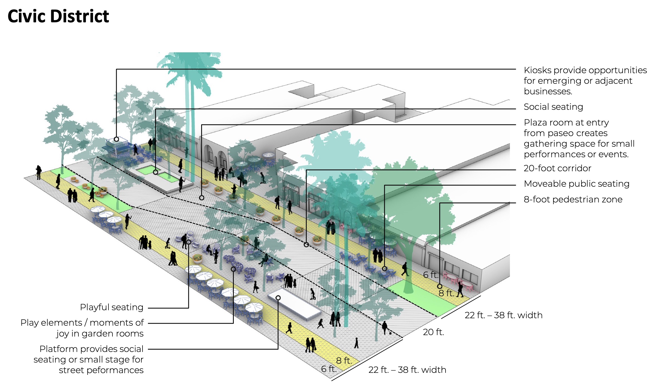 The idea is that each of the three districts will have “a unique sense of place, look and feel, and site layout,” with “at least one plaza/gathering area in each district” and the goal of “[accentuating] connections to the paseo network and key downtown institutions, spaces, and destinations.”