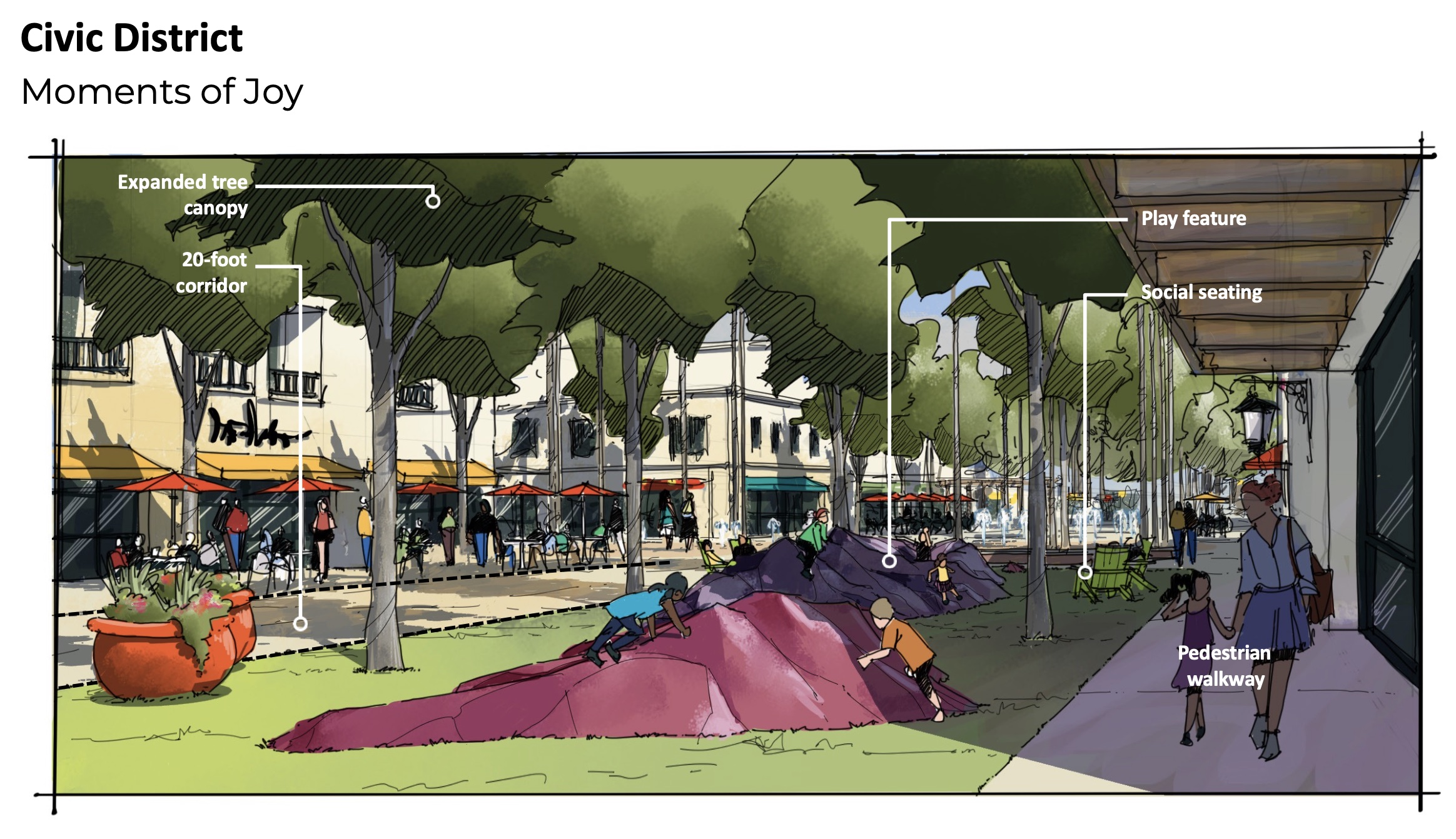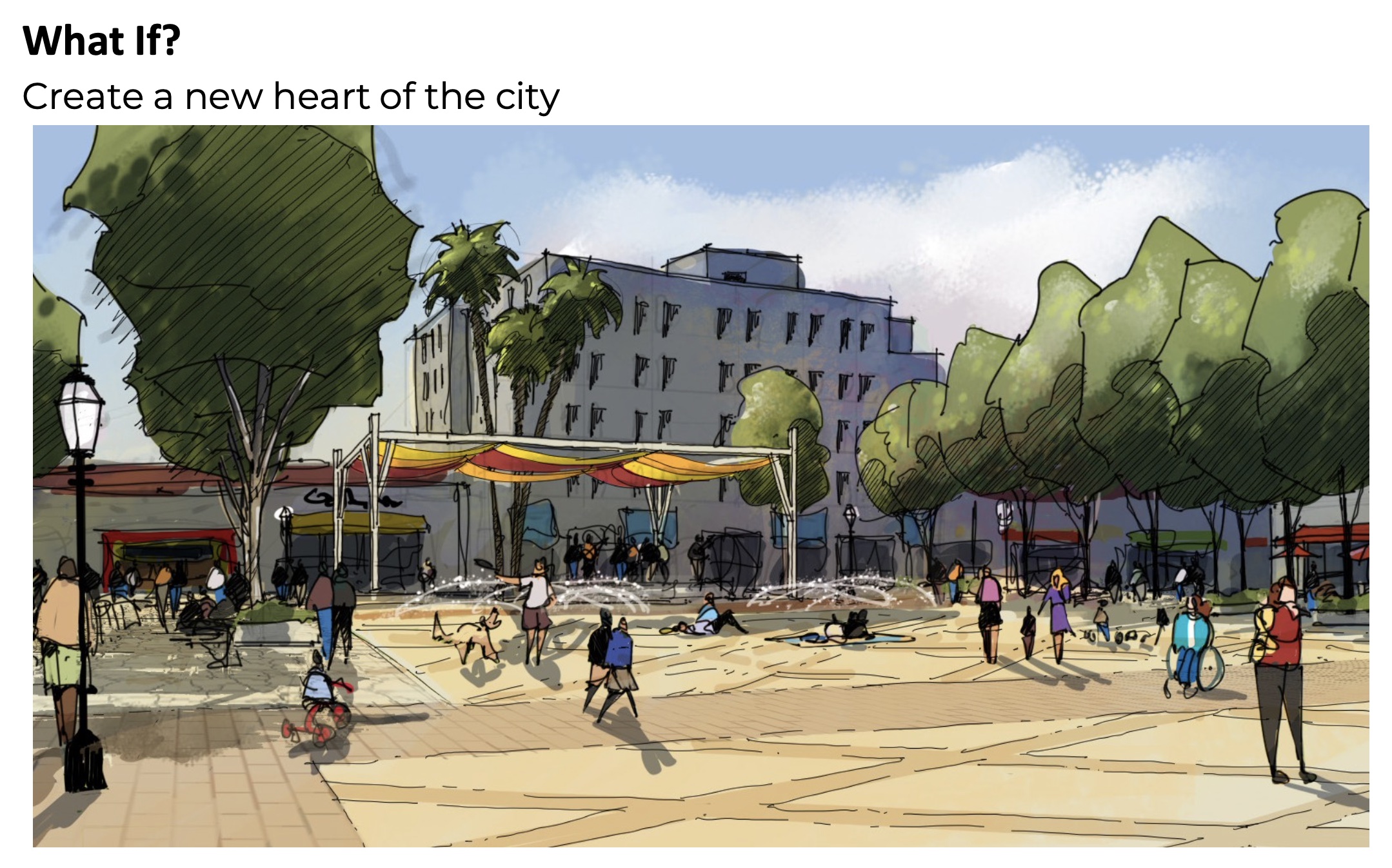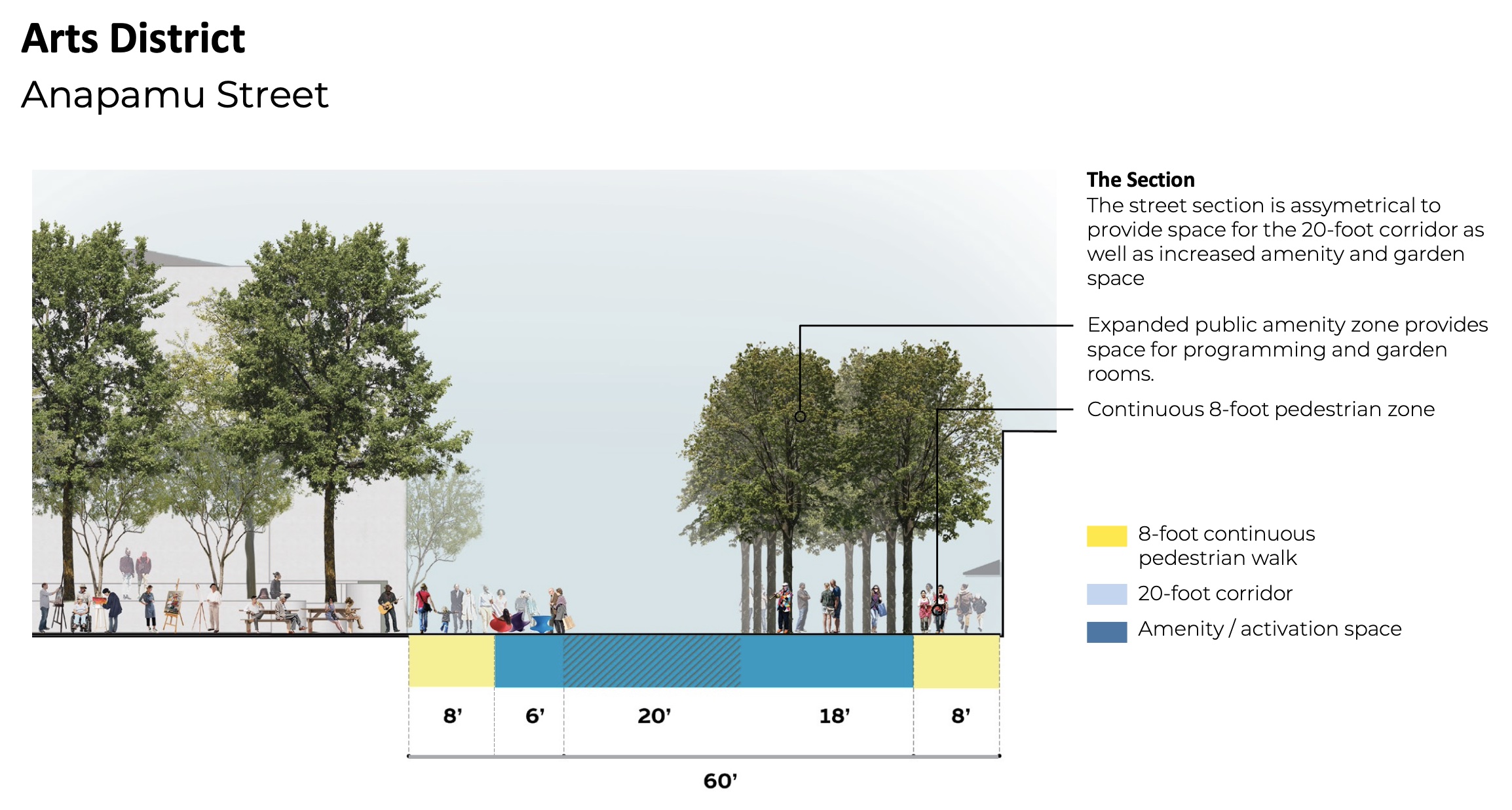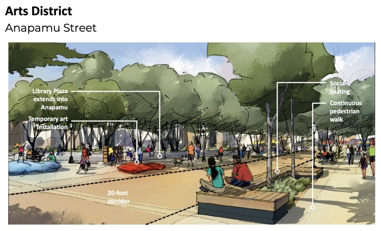 The idea is that each of the three districts will have “a unique sense of place, look and feel, and site layout,” with “at least one plaza/gathering area in each district” and the goal of “[accentuating] connections to the paseo network and key downtown institutions, spaces, and destinations.”