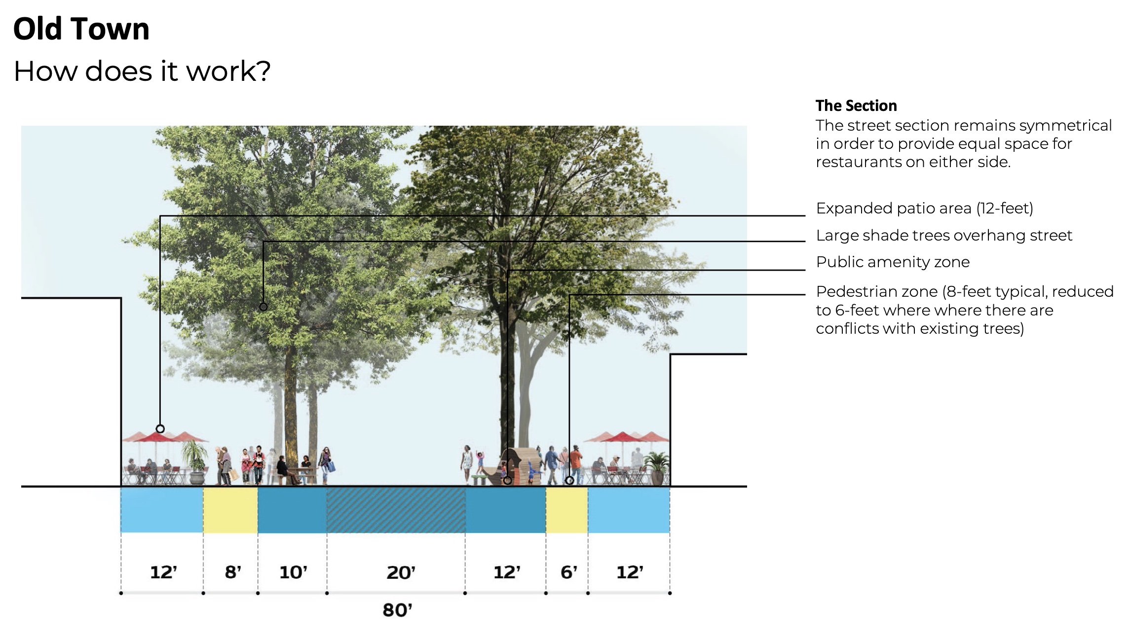 The presentation included a big disclaimer: “All concepts shown include a 20-24-foot corridor that could support most mobility options. The illustrations do not represent or assume any mobility options, which could be interpreted as promoting a pedestrian-only solution for all 10 blocks. This is not the case.” And yet it was followed by a slide that made closing the street to cars seem like a foregone conclusion: