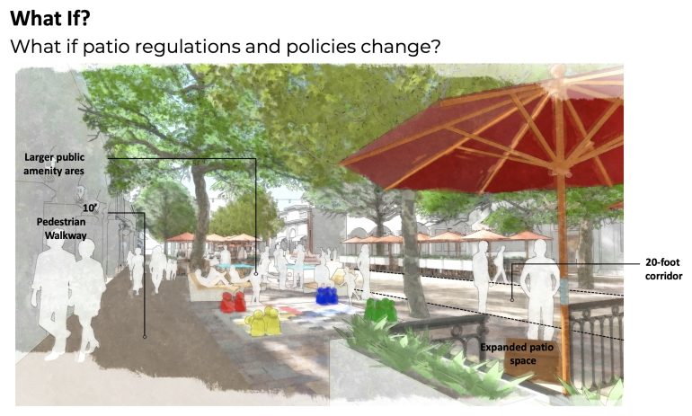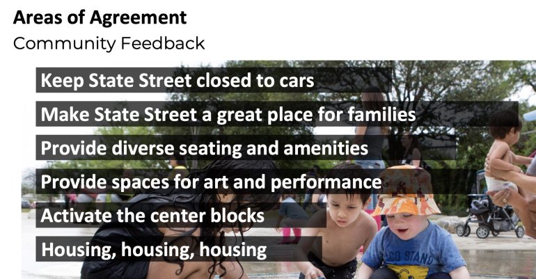 The challenge with rethinking State Street is that we all bring a unique set of priorities. Personally, I have three: outside dining; a more cohesive, less ragtag look; and to feel safe. While I enjoy riding my bike on State, I don’t feel safe walking anywhere but the sidewalks, thanks to the people on electric bikes. And aside from extending the tree canopy, nearly everything in the presentation—buskers, community posting boards, retail kiosks, immersive lighting, games, interactive water features, people paying Frisbee or catch—sounds like stuff I’d cross the street to avoid, even if done well. Is anyone taking into consideration the costs of maintaining and programming such a space?