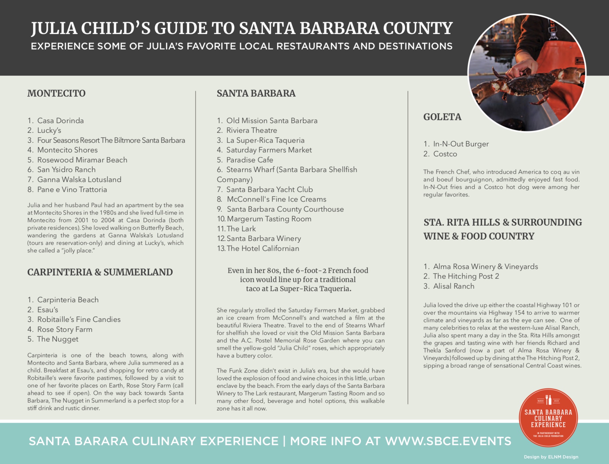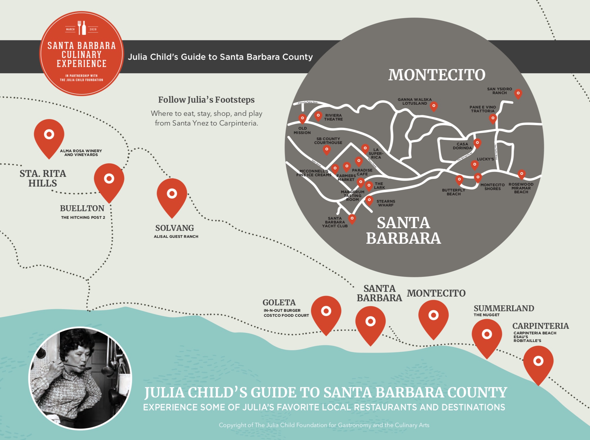 ••• A new, complimentary downloadable Julia Child Map [below] of the beloved chef’s favorite haunts in the Santa Barbara area for self-guided tours. [Note: She liked Lucky’s?! The mind reels.]