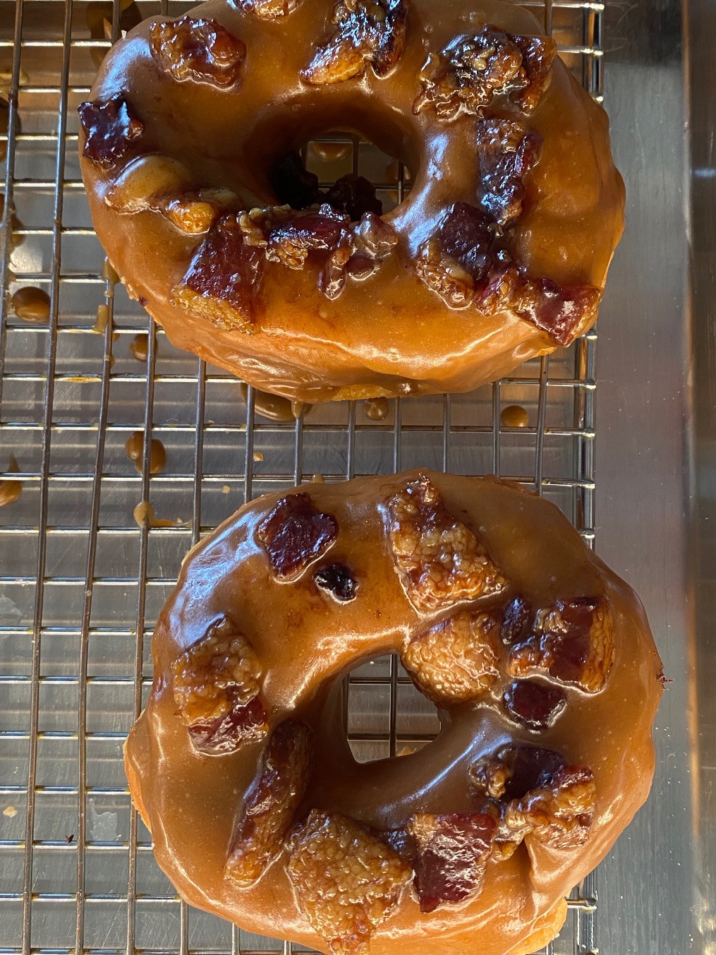 ••• Onus Donuts, now open on State Street between Haley and Gutierrez, is worth a visit. The room is pretty spare, with an old-school diner-style counter. I’m a traditionalist when it comes to donuts, hence the cinnamon-crumb one I ordered (below), but there are also more ornate varieties (such as maple-bacon, further below), donut-hole kebabs, and vegan donuts.