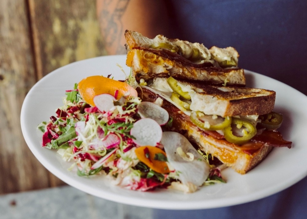 ••• Buttonwood Farm & Winery outside Ballard is now serving food Friday through Sunday, 11 a.m. to 5 p.m.: “Chef Peter Cham, who you may know from our sister winery, Roblar, has brought his talents to Buttonwood Farm & Winery. On the menu: jalapeño cornbread, deviled eggs, ‘fancy’ pimento cheese spread with dungeness crab, Buttonwood Farm salad, bacon grilled cheese [above?], Chamburger, BBQ half chicken. Many of the ingredients are sourced from Buttonwood Farm and Roblar Farm, and the rest come from local or sustainable sources.”