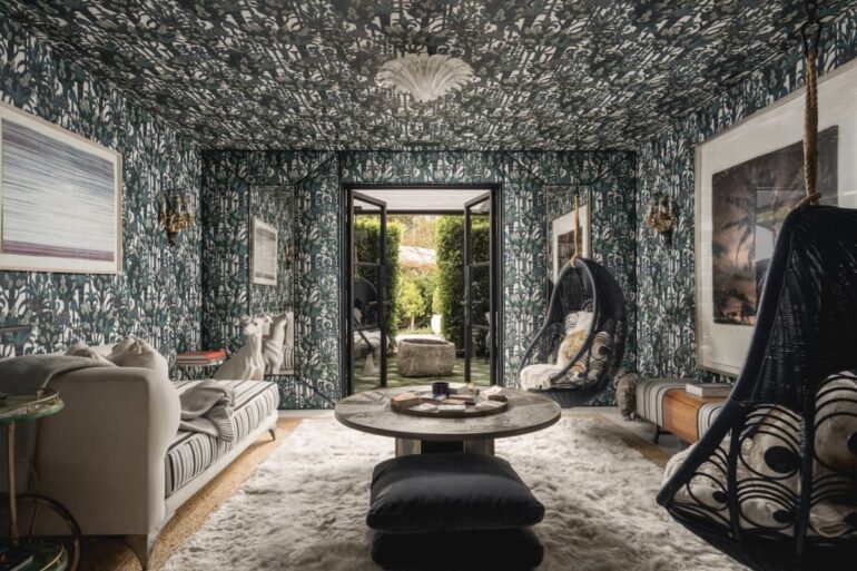 While the outside spaces are lovely, the inside of the ‘black’ house is a total redo in my book except for the windows/doors. Garish wallpaper, even on the ceilings? No cabinets in the kitchen (or in the bathroom from the only one photo posted)? A nook for the bed that you can barely get out of? Even the ‘kids room’ painted black? This is a clear example of a designer gone wild.