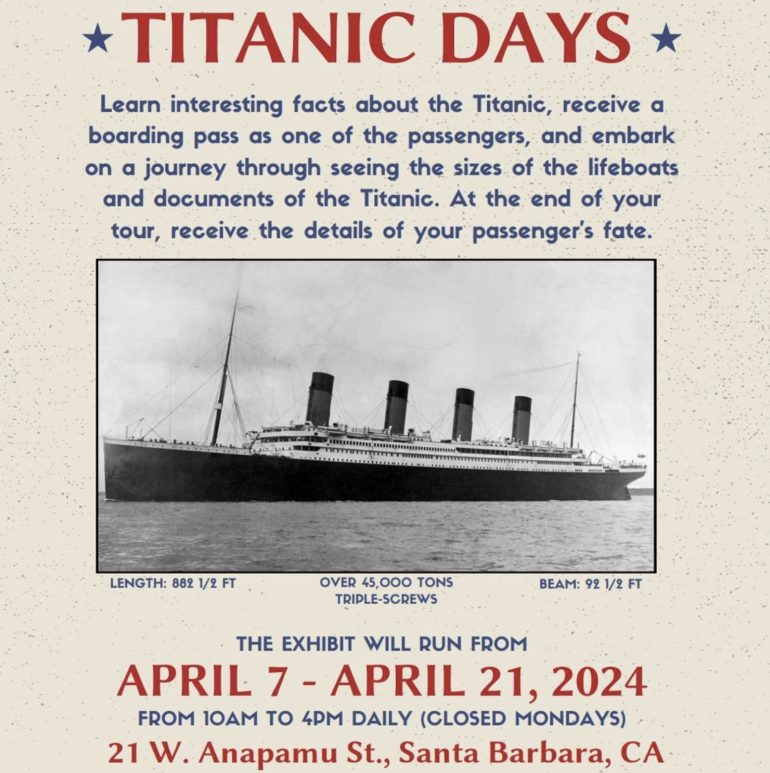 ••• Titanic Days is up through April 21 at the Karpeles Manuscript Library Museum. Love how you discover your fate at the end.