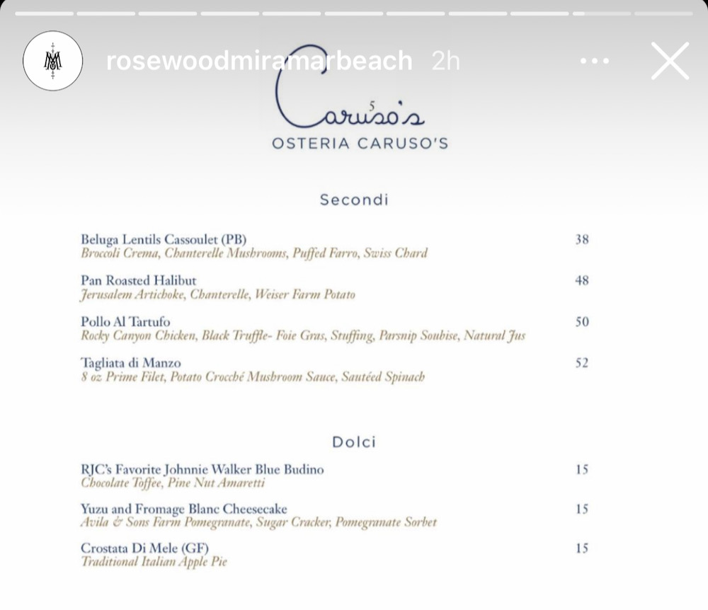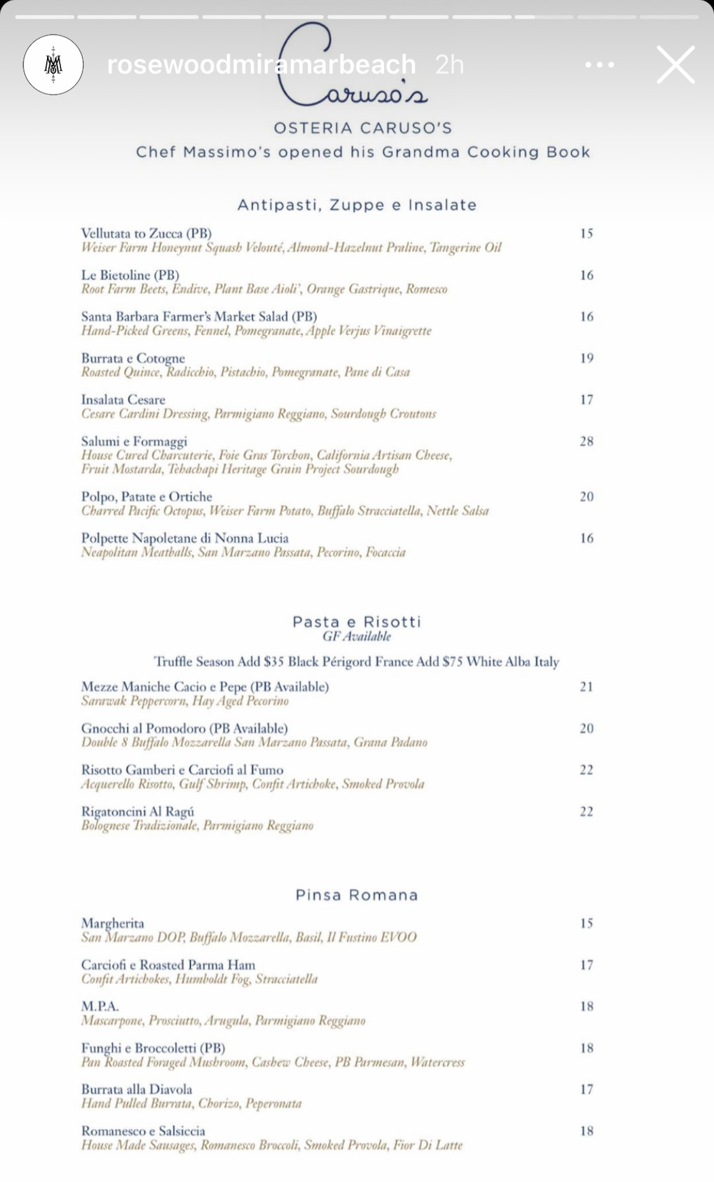 ••• The Rosewood Miramar Beach resort’s food truck is back in action near the beach bar, serving food and drinks to enjoy on the beach. Unsurprisingly, prices are higher than at your average food truck. Caruso’s, meanwhile, has morphed into “Osteria Caruso’s, a to-go, simple and sophisticated menu featuring fresh, local ingredients from neighboring farmers and ranchers. ⁠[Menu here and here.] Orders can be placed in advance by dialing 805-881-2424 from 9 a.m. to 7:45 p.m. to be ready for pick-up from the Miramar Food Truck from 4 p.m.-8 p.m. daily.” More high-end takeout can be found at the San Ysidro Ranch’s Stonehouse.