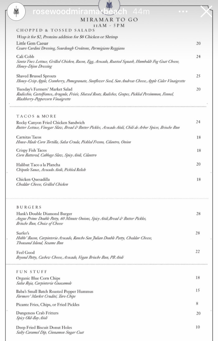 ••• The Rosewood Miramar Beach resort’s food truck is back in action near the beach bar, serving food and drinks to enjoy on the beach. Unsurprisingly, prices are higher than at your average food truck. Caruso’s, meanwhile, has morphed into “Osteria Caruso’s, a to-go, simple and sophisticated menu featuring fresh, local ingredients from neighboring farmers and ranchers. [Menu here and here.] Orders can be placed in advance by dialing 805-881-2424 from 9 a.m. to 7:45 p.m. to be ready for pick-up from the Miramar Food Truck from 4 p.m.-8 p.m. daily.” More high-end takeout can be found at the San Ysidro Ranch’s Stonehouse.