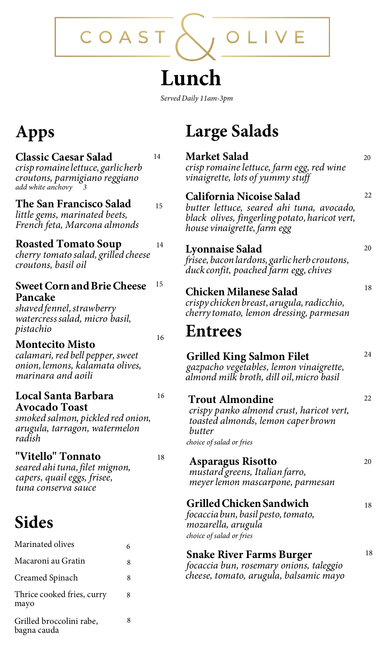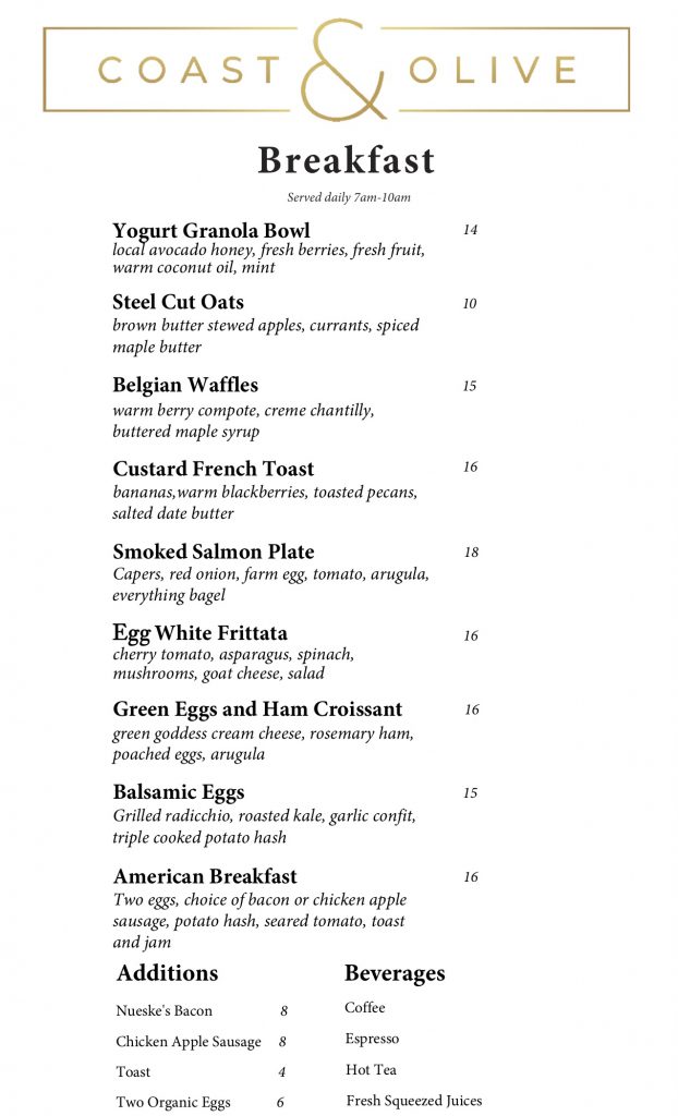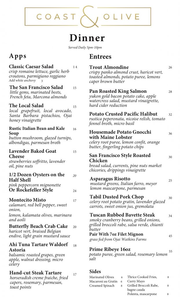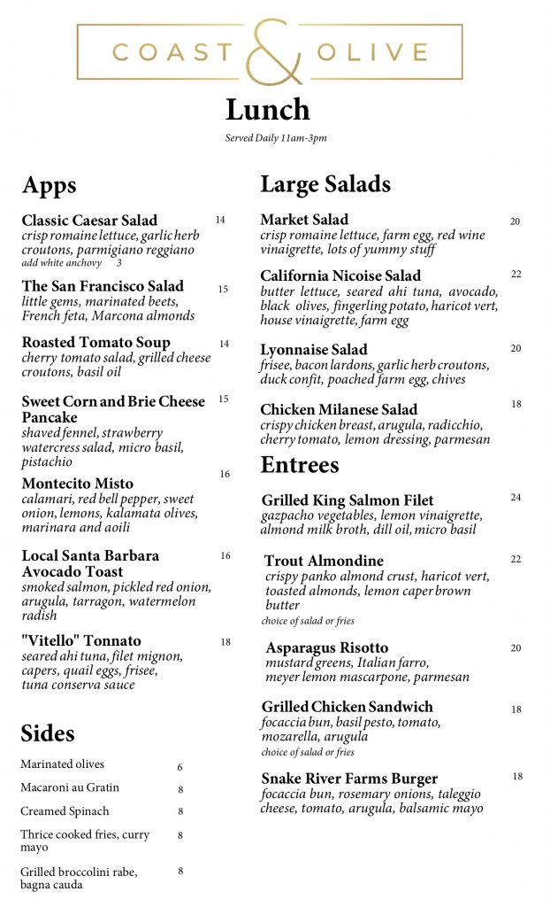 Back in October, after The Monarch and Silver Bough closed, the Montecito Inn‘s owners announced their plan to run the space themselves as “an all-day restaurant to serve both the guests of our hotel as well as Montecito and Santa Barbara locals.” That day is near: Coast & Olive, as the restaurant is named, will be ready to serve takeout in a week or so. I stopped in yesterday to say hello, and the space looks sharp. Here are the menus*: