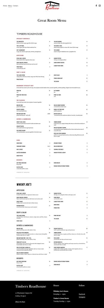 ••• Timbers Roadhouse and a sister establishment, Whiskey Joe’s, have opened in Goleta. The former is a steakhouse; the latter is more of a bar and grill. Both menus are below (click to enlarge). —Restaurant Guy