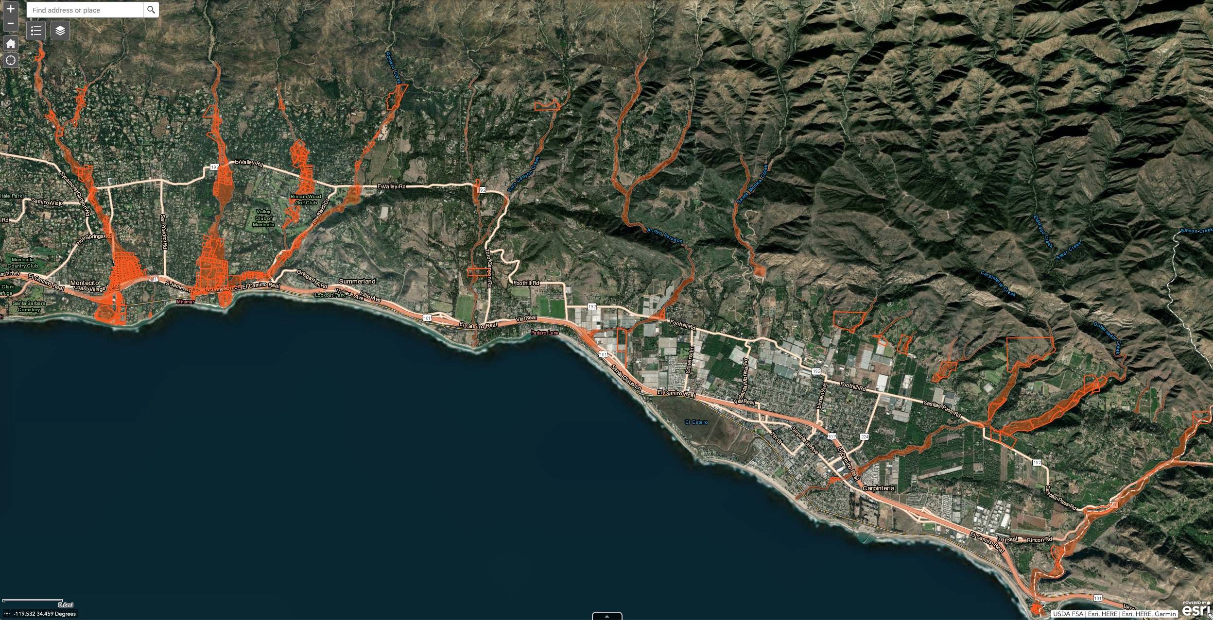 The new Storm Impact Consideration Map is live. Go there if you want to check a specific address. But here’s a general overview, with screenshots. According to the Montecito Journal, nearly 1,000 properties have been removed from the red zone—good news for the owners and the real-estate market in general. (It’ll be interesting to see whether more properties get listed as a result.) For more info on the map, there’s a meeting tonight at 5:30 p.m. at Montecito Union School, or you can watch it online. [UPDATE: I should’ve clarified that the county and fire department are calling this a Storm Impact Consideration Map, rather than a Debris Flow Risk Map, as it was previously known, and that they say it won’t be used to decide who gets evacuated. That’s some solace for the 517 parcels still in the red zone.]