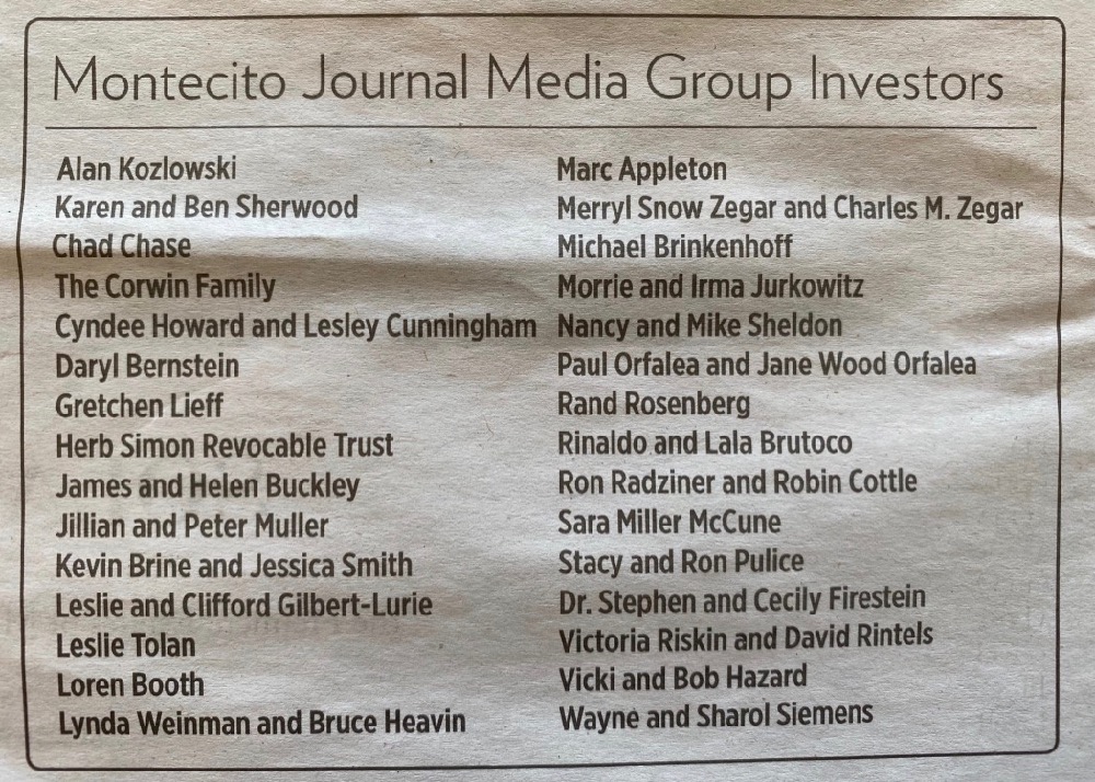 ••• “Beginning this January [Jim and Tim Buckley] will be running the Montecito Journal no more, having sold to Gwyn Lurie—a onetime Hollywood screenwriter and former ABC News writer who served eight years on the Montecito Union School Board. Lurie and a team of 42 mostly local investors have amassed a $2.3 million war chest to buy the paper outright and provide the operating capital to get the new venture going.” The Montecito Journal’s article about the sale says there are actually 50 investors—did they do a GoFundMe or something?—and printed the list shown here. It’ll be interesting to see how a publication with so many owners navigates conflicts of interest. —Independent