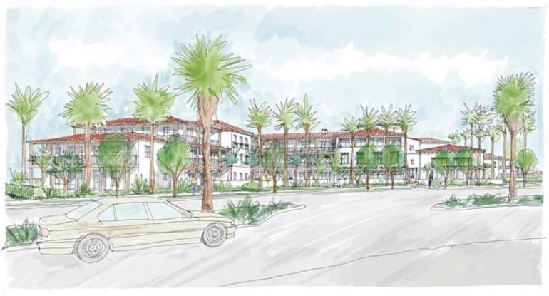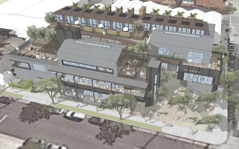 On hold for a while, the large resort coming to 101 Garden Street in the Funk Zone looks it’s like going to start progressing again, having presented an archaeology report to the Historic Landmarks Commission in December. From that agenda: “The project consists of a new 250-room, 231,300-square foot (net) hotel located on a 4.53-acre site at the southwest corner of Garden and E. Yanonali Streets, in El Pueblo Viejo Landmark District. […] The hotel would consist of 119 standard guestrooms and 131 extended-stay guestrooms. Amenities for the hotel guests would include restaurants, bar, lounge, library, media salons, meeting rooms, fitness rooms, market, laundry rooms, a pool, and a roof deck with trellis. A total of 267 parking spaces would be provided (39 surface and 228 in an underground parking garage). All existing structures and uses on the site would be removed.” The Cearnal Collective rendering below is out of date, but it gives a sense of the scale.