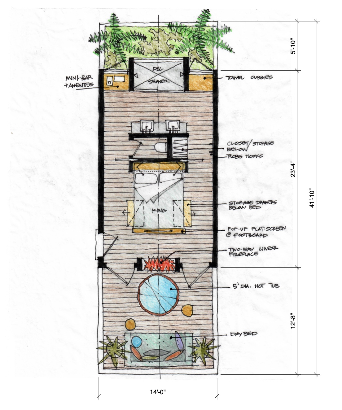 The three-story development proposed for the southwest corner of Anacapa Street and E. Mason Street includes a corner market, myriad restaurants, a tasting room, an art gallery, and, on the third floor, 12 hotel rooms. Note the shower facing a mini garden and the hot tub in an enclosed area abutting the courtyard.