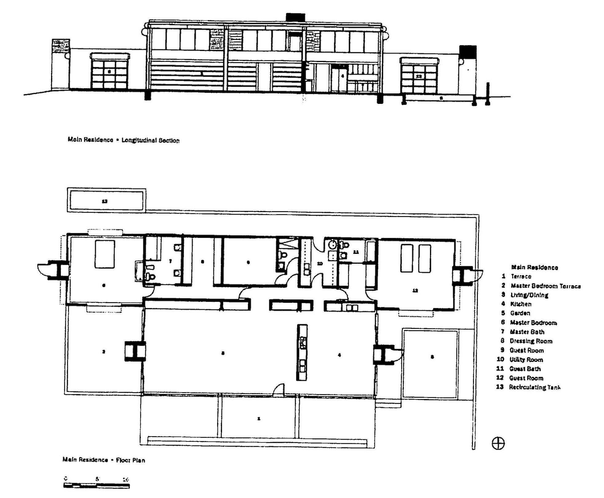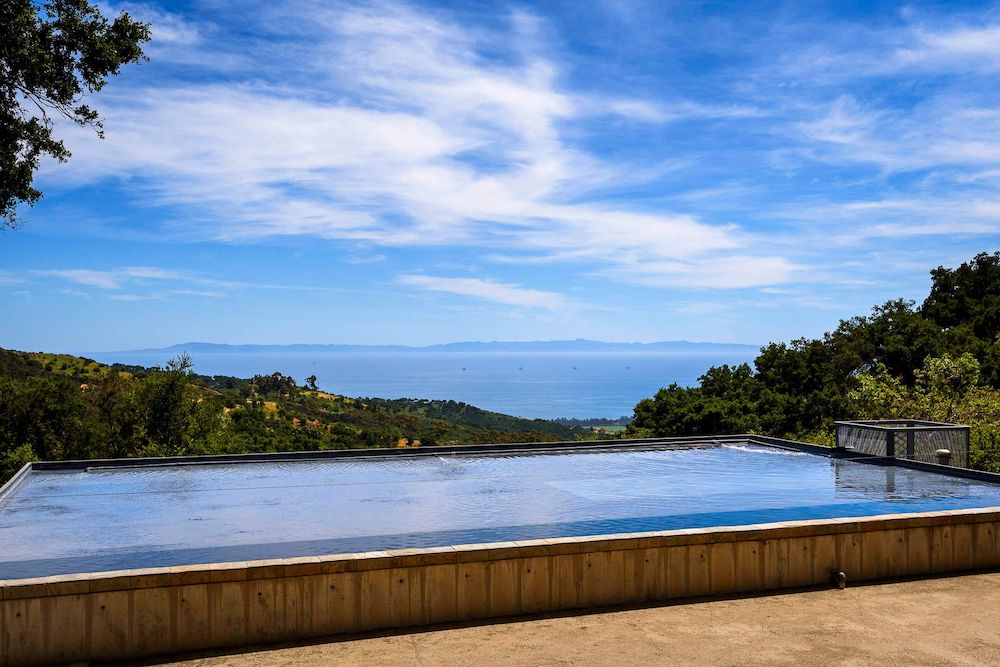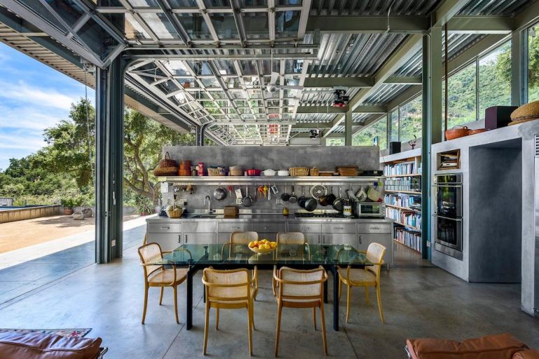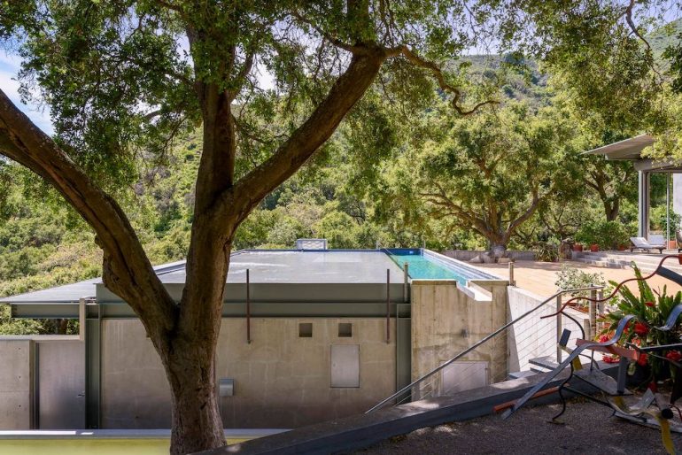 “In addition to being constructed almost completely out of noncombustible materials, all of the glass openings contain rolling steel shutters so that the compound can be sealed within 30 minutes,” says the Mansion Global article. And what looks like a funky swimming pool is actually, per the listing, “a shallow layer of recirculating water, on two of the flat roofs, [that] is a brilliant insulation and fire resistant feature.” There’s also an adjacent 45-foot lap pool.