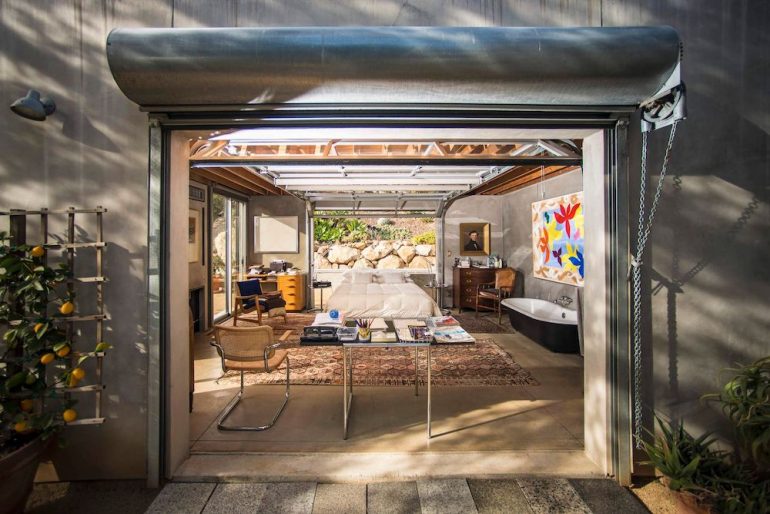 The vibe is industrial, with concrete floors, 16-foot-high ceilings, and a lot of bare steel. There’s room for quirk, too: note the tub in the first photo below.