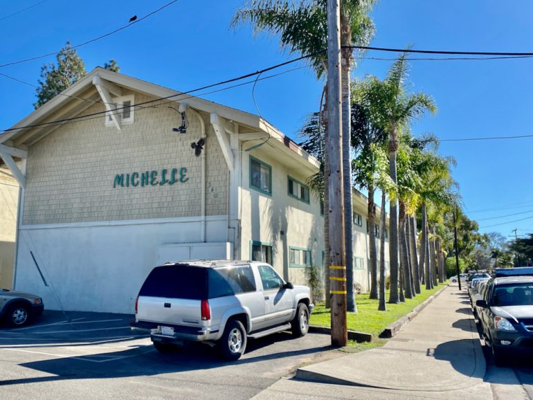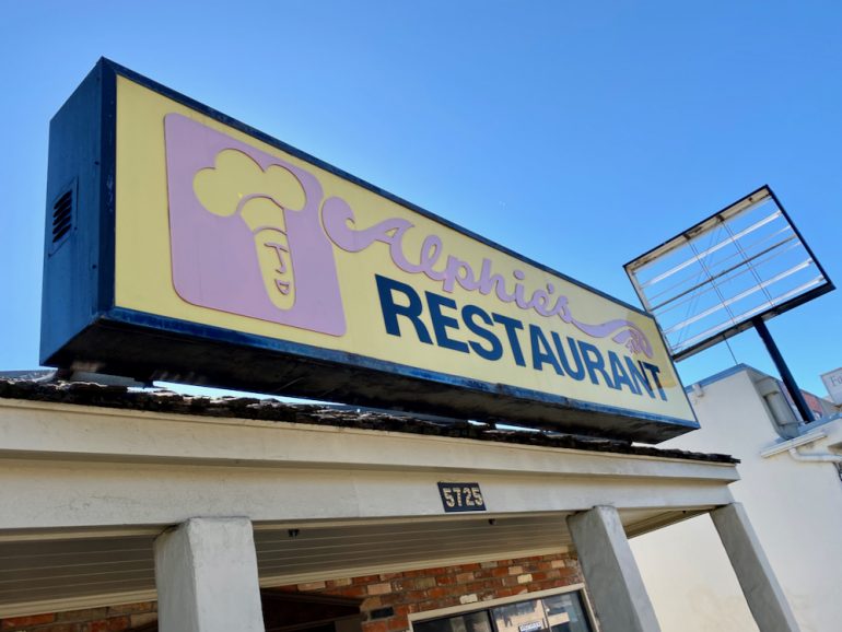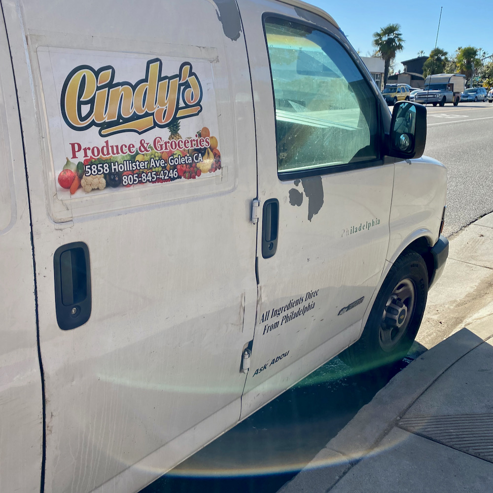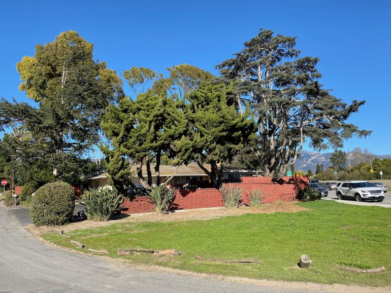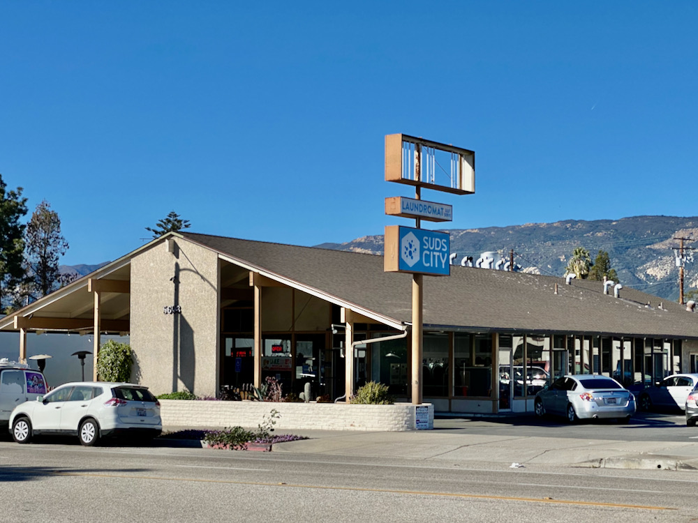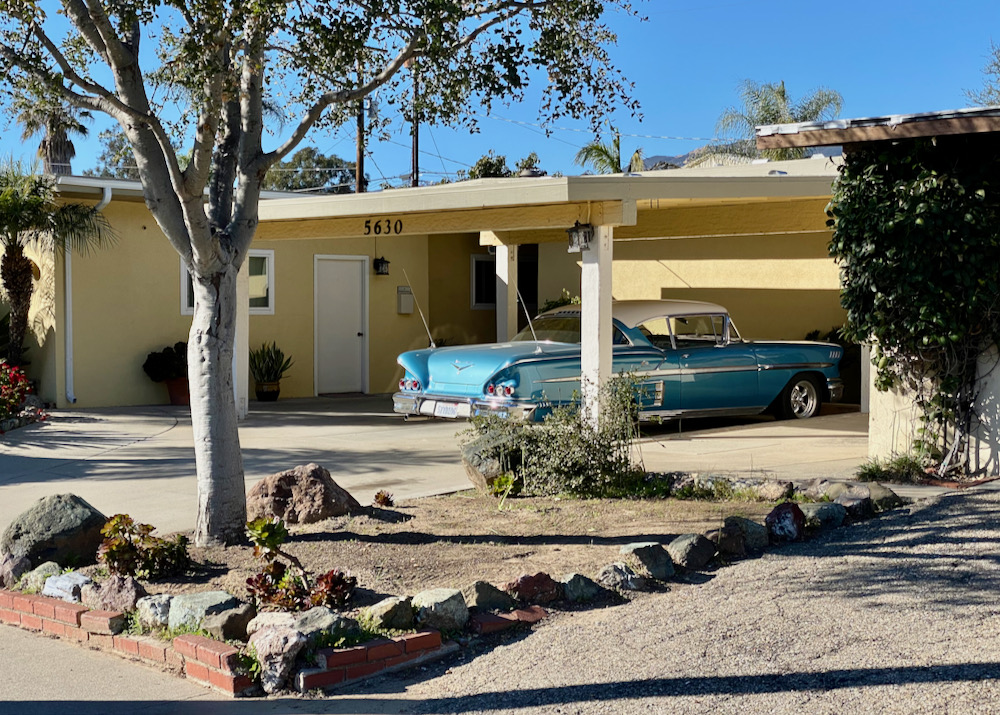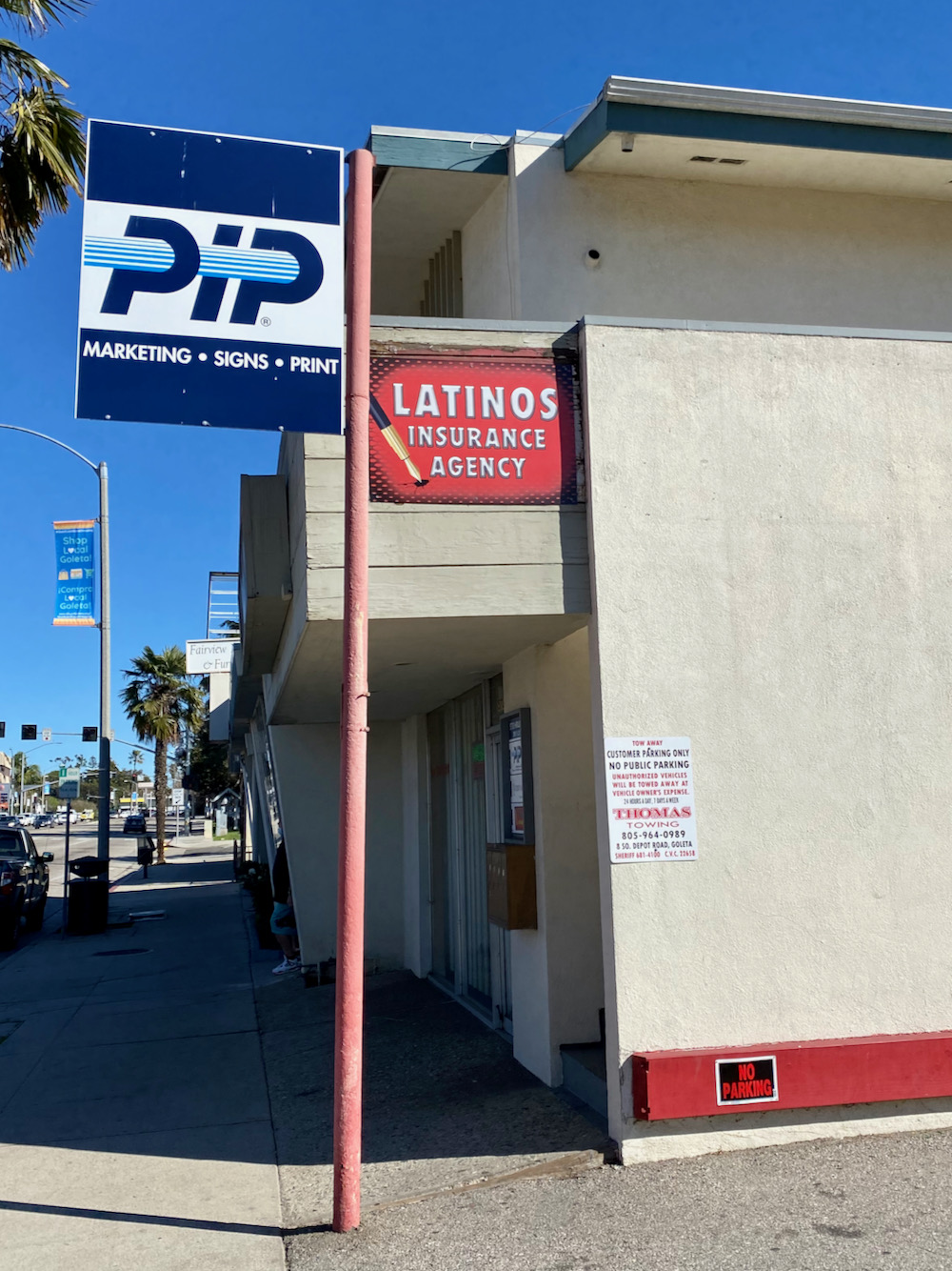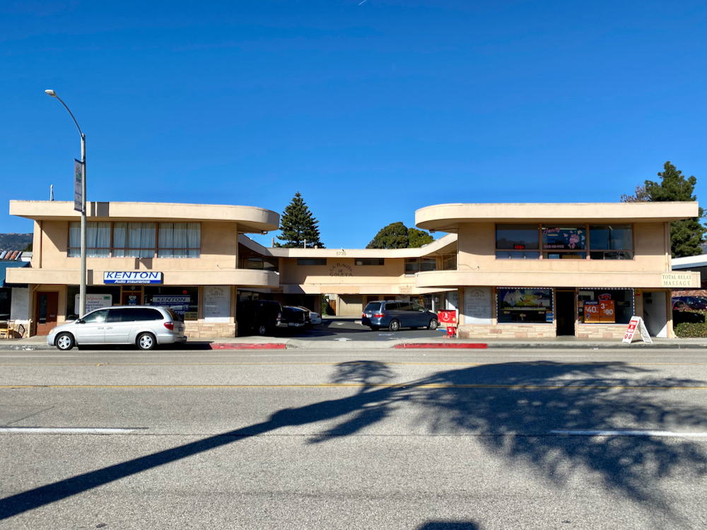 Then we committed to the main drag of Hollister Avenue for a bit. The name of Latinos Insurance Agency sure seems a bit on the nose. Anyway, I loved the Miami Beach-ish office complex in the second photo, and the old-school vibe of Alphie’s Restaurant, closed for the pandemic.