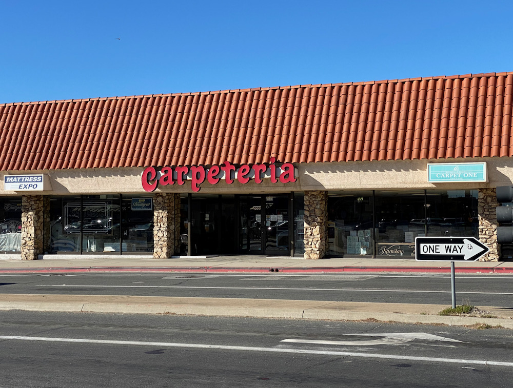 I tried to explain to L., who did not grow up in California, how the Carpeteria font and jingle are seared into my brain from years of seeing its TV commercials. (“Anso IV nylon pile!”) The jingle also made me mispronounce Carpinteria for a long time.